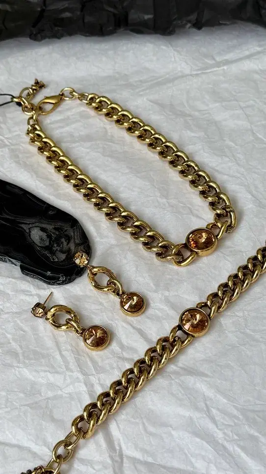 Колье плоская цепь с персиковым кристаллом Swarovski. Длина - 40 -45 см. Оттенок золото.