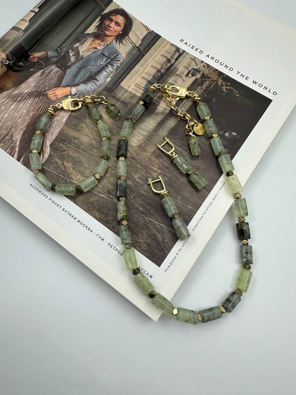 Колье с пренитом и гематитом, оттенок золото