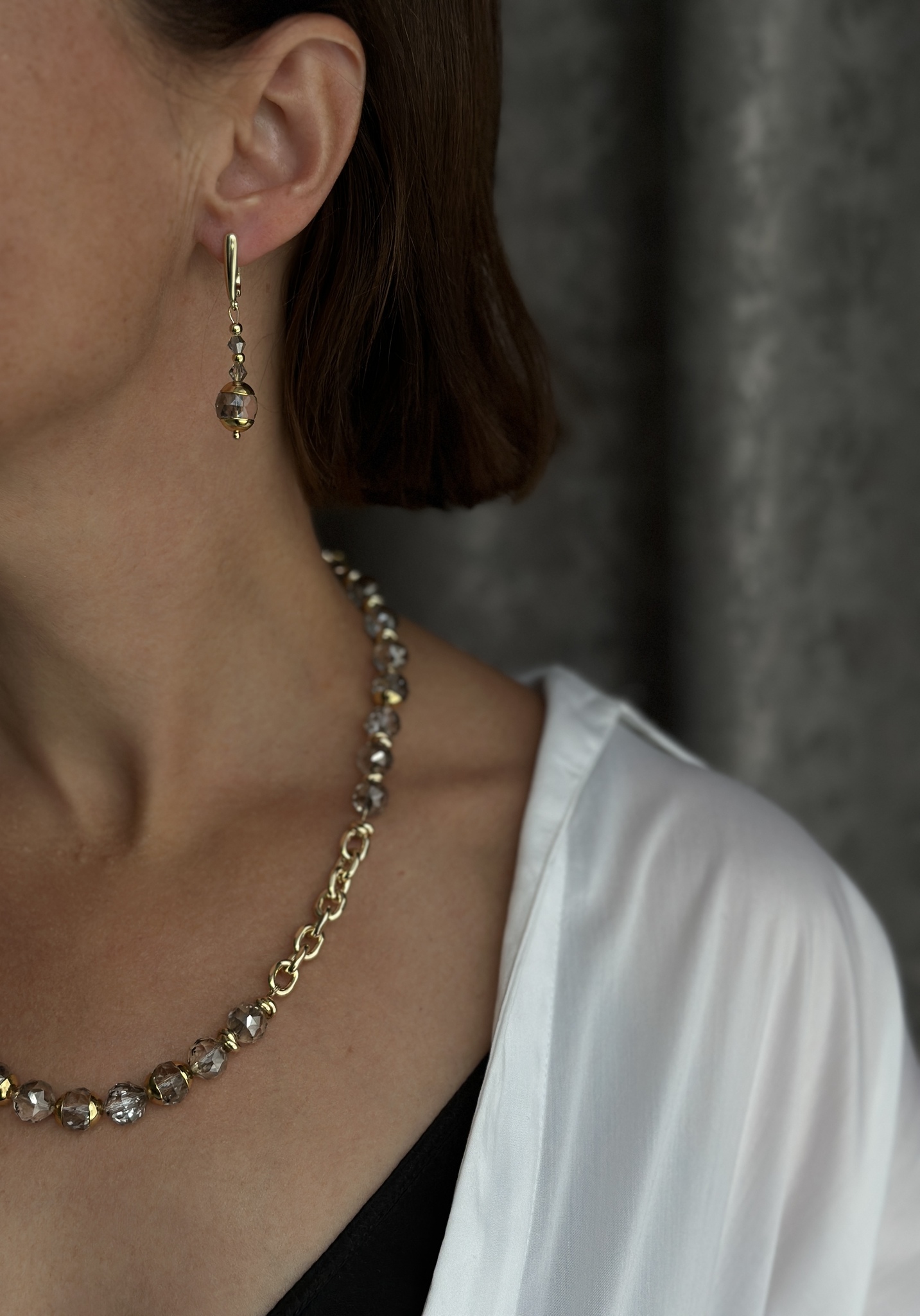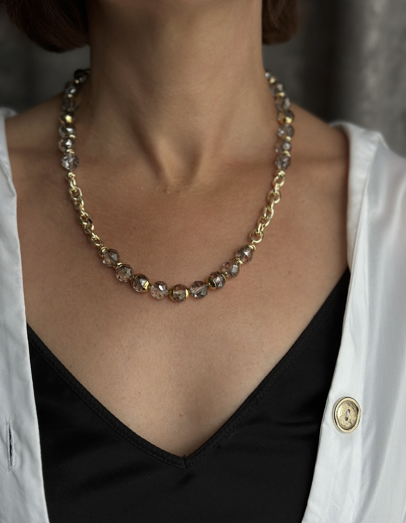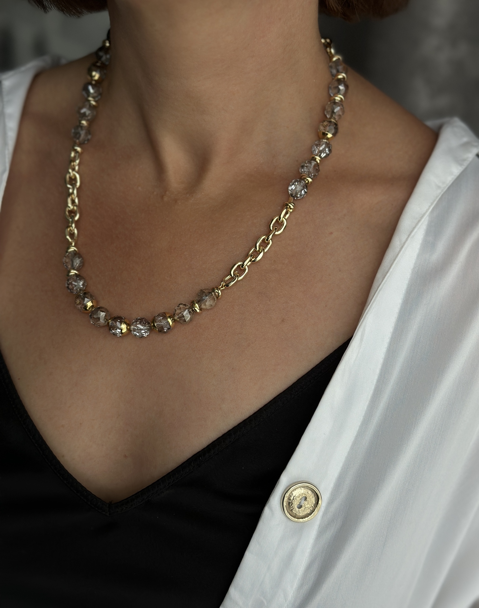 Колье с серым чешским стеклом на цепочке ролло, оттенок золото. Регулировка длины.