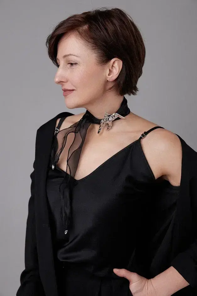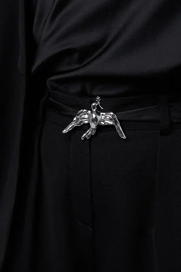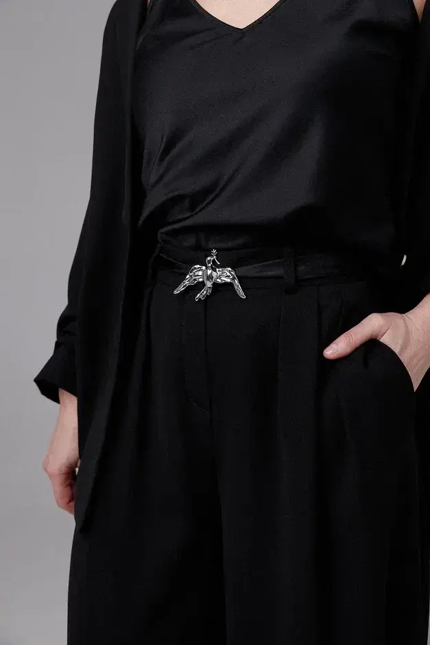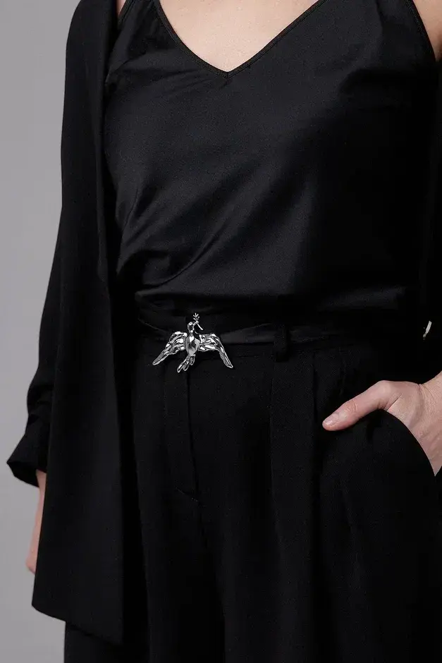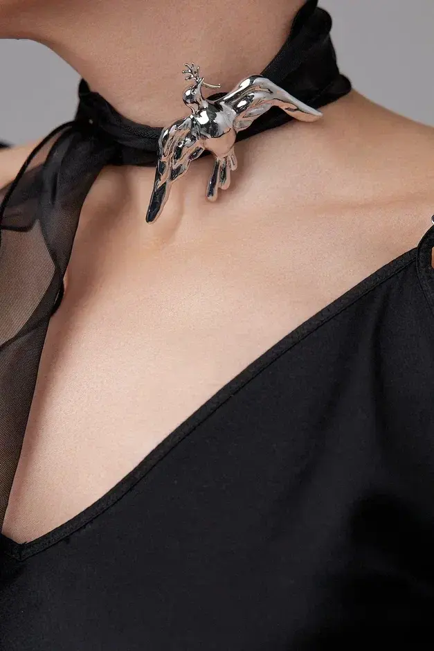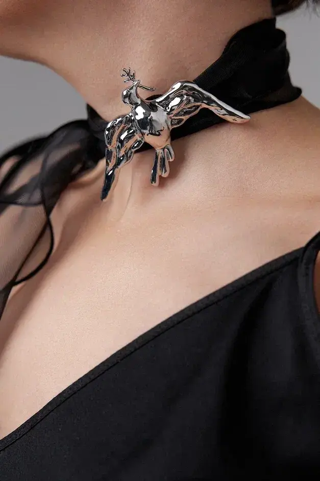 Колье Serenity птица в оттенке серебро на черной ленте из органзы. Носим в качестве шейного украшения либо на поясе.