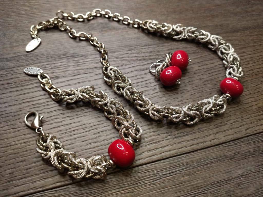 Колье Византия биколор: серебро и графит с красным плоским жемчугом Майорка
