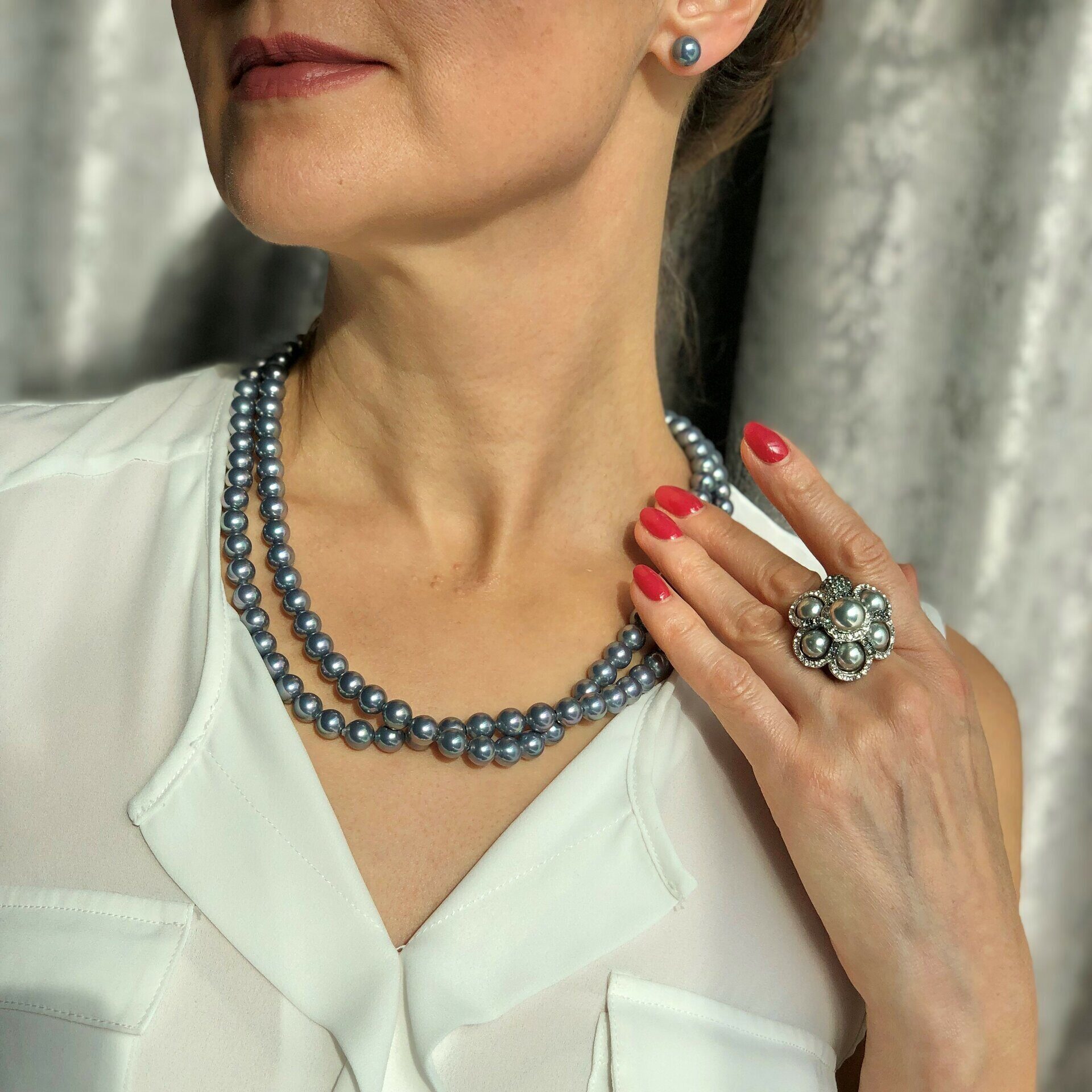 Кольцо из родированного сплава с серым жемчугом и кристаллами.