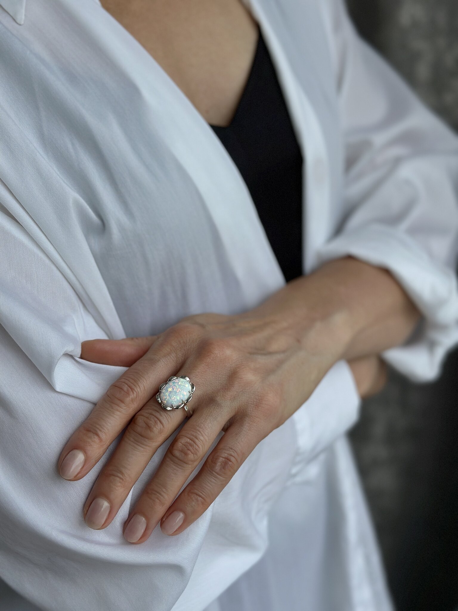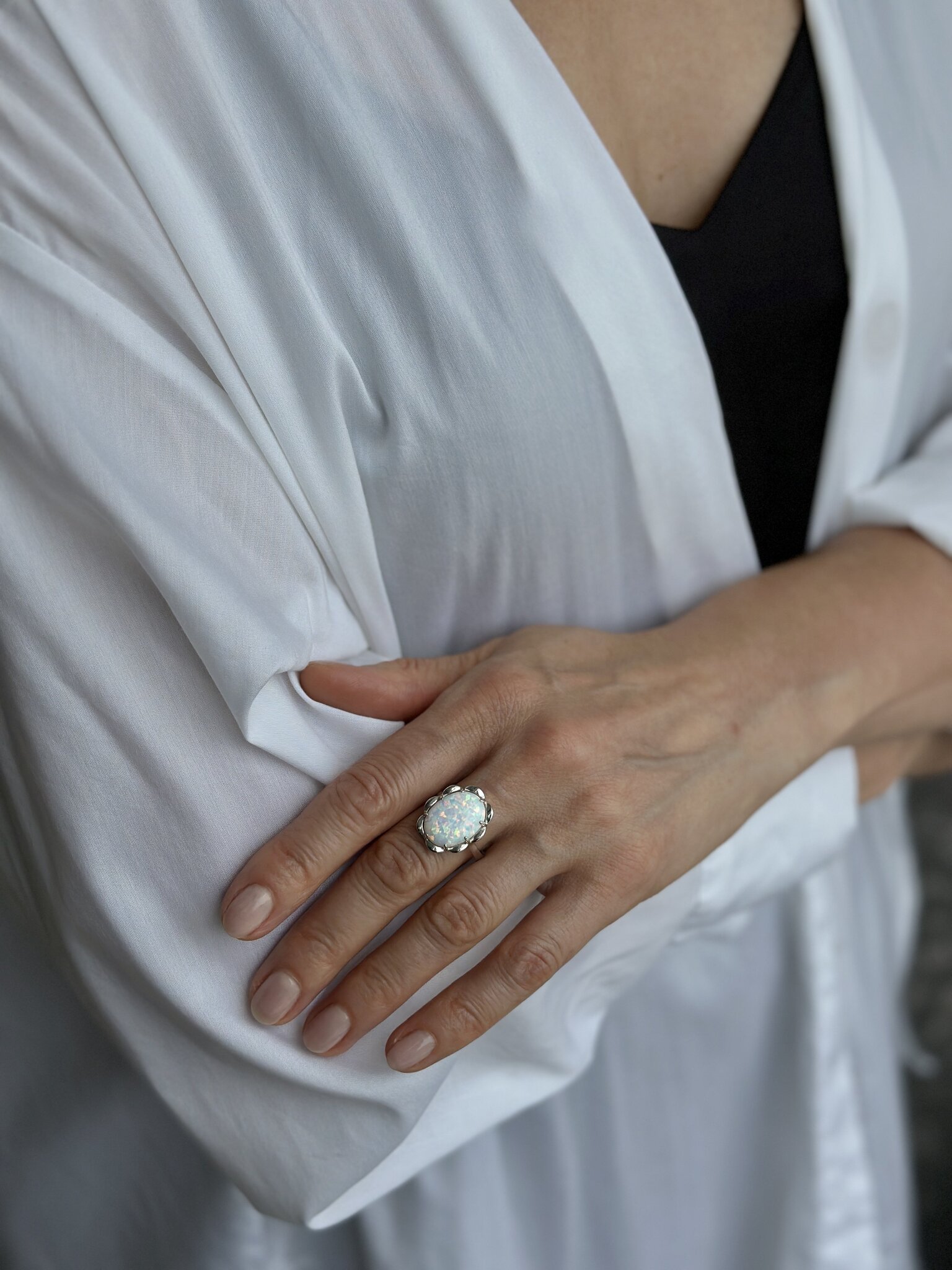 Серебряное кольцо с синтетическим опалом. Размер 18. Серебро 925.