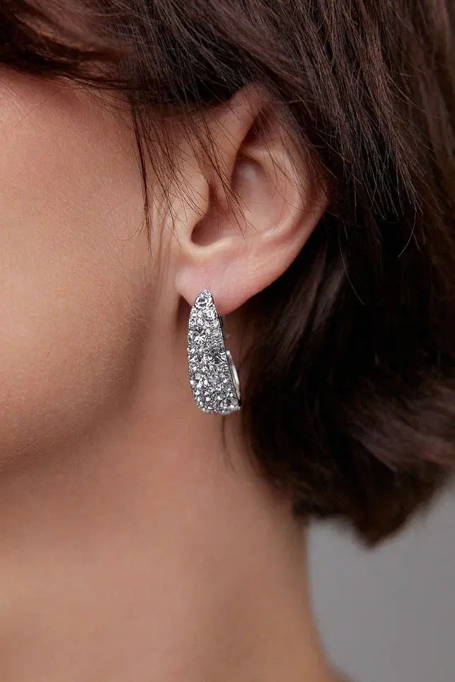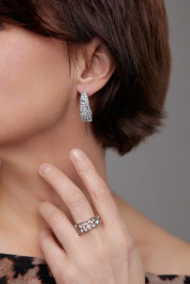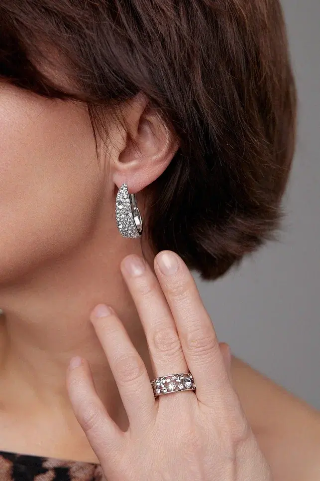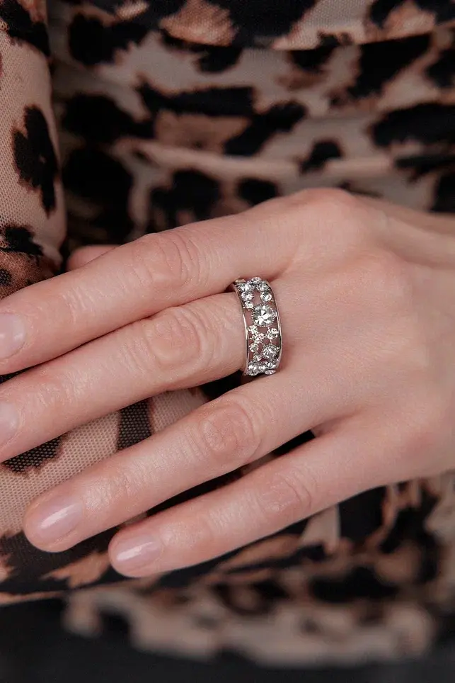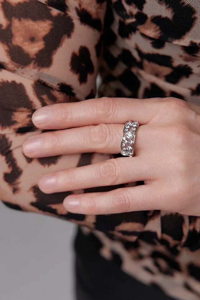 Кольцо безразмерное с прозрачными кристаллами, оттенок серебро. Ширина 1 см.