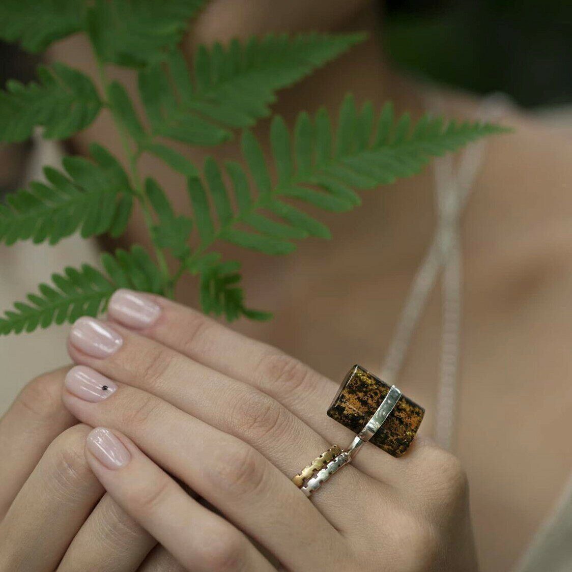 Кольцо "Квадрат", серебро 925, натуральный янтарь.
