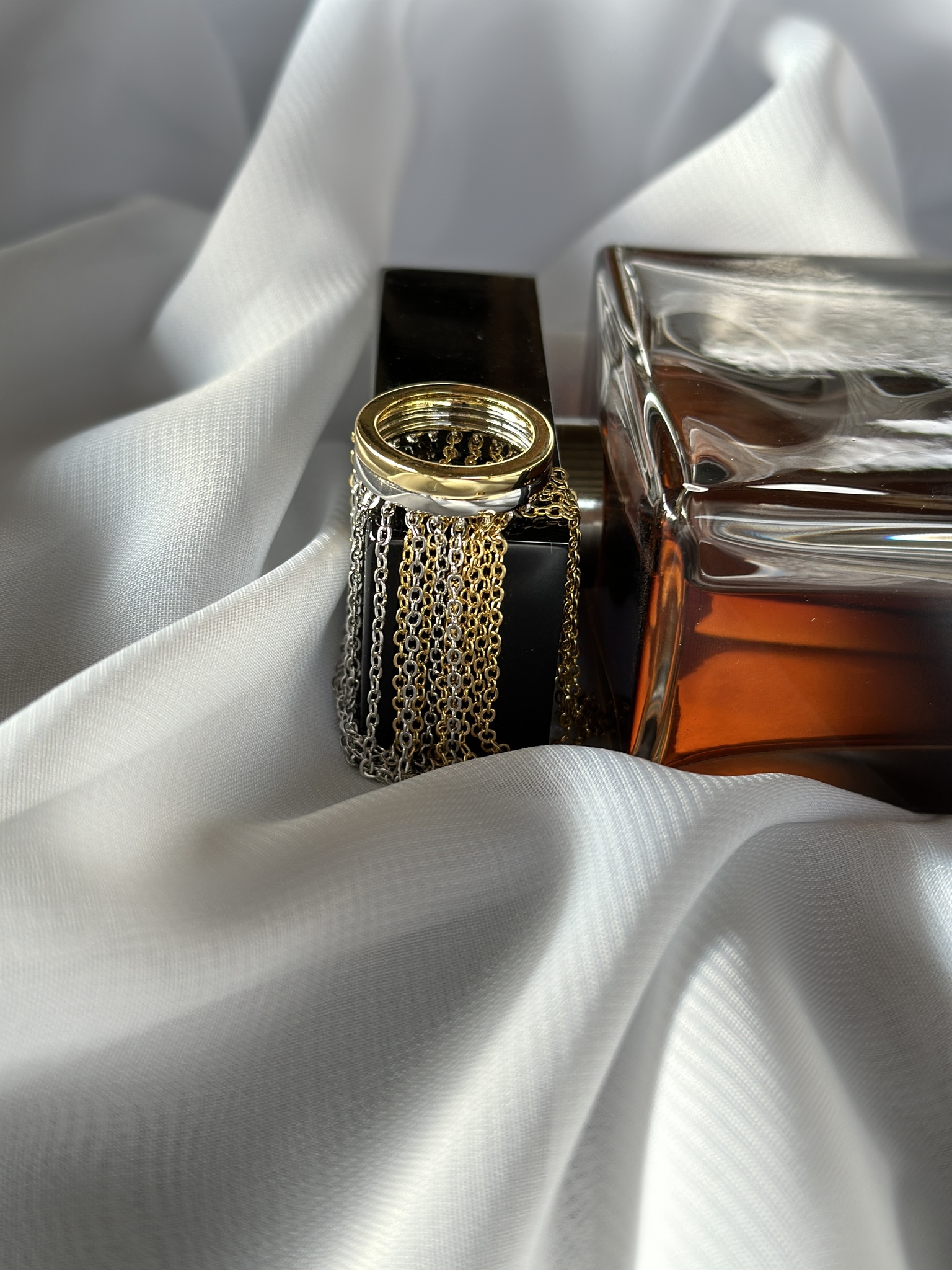 Кольцо сталь с тонкими длинными цепочками, биколор золото и серебро.