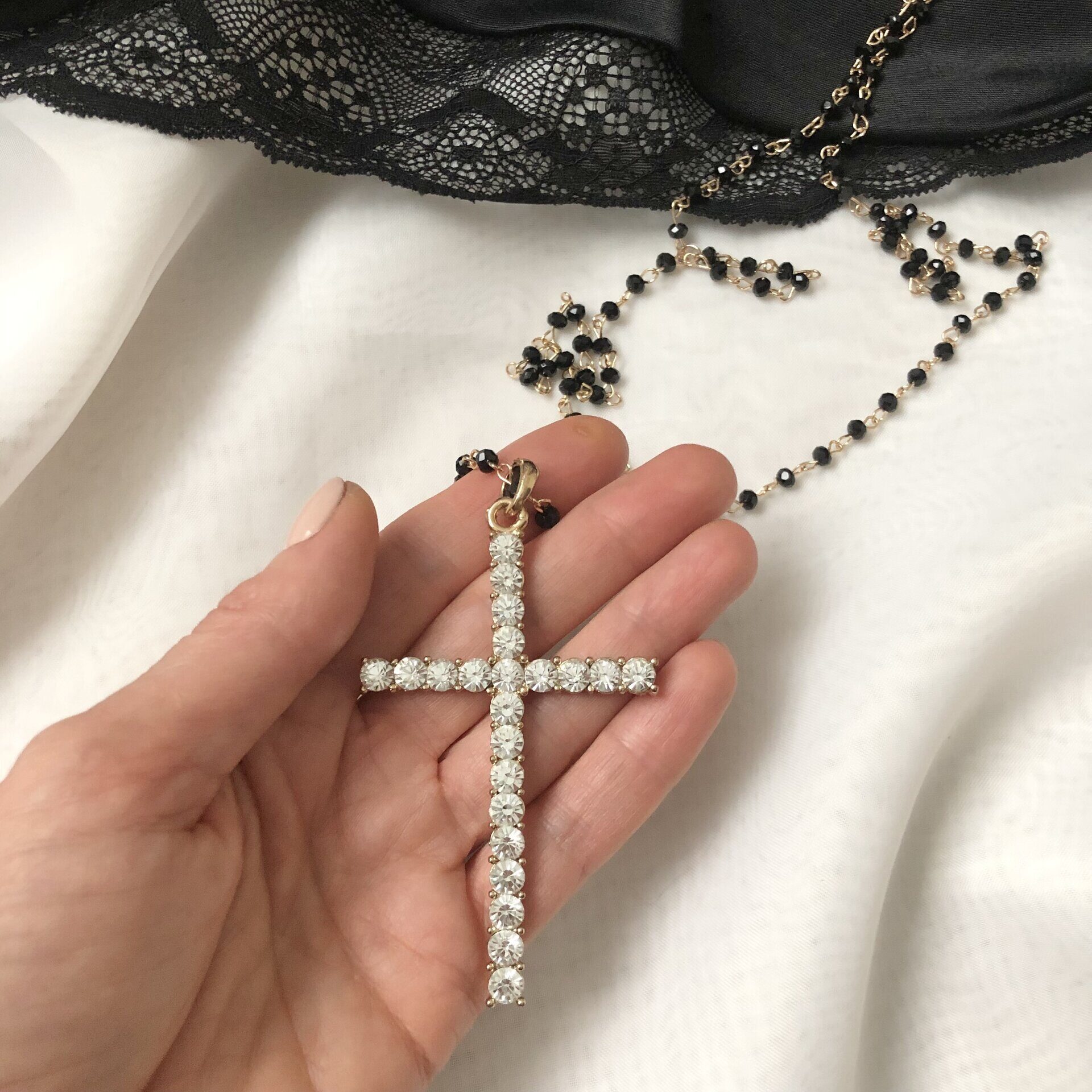 Крест с прозрачными кристаллами на тонкой длинной черно-золотой цепочке, Италия