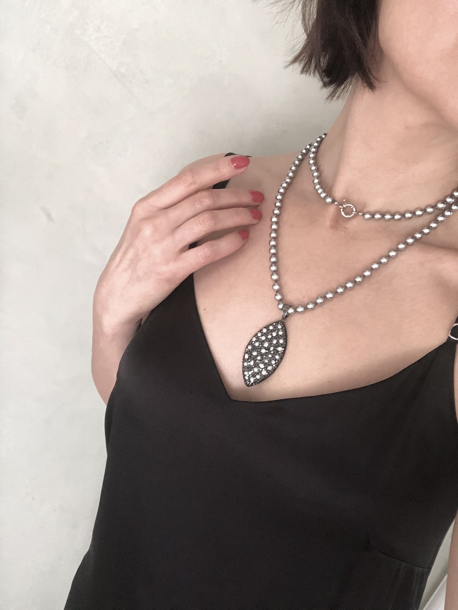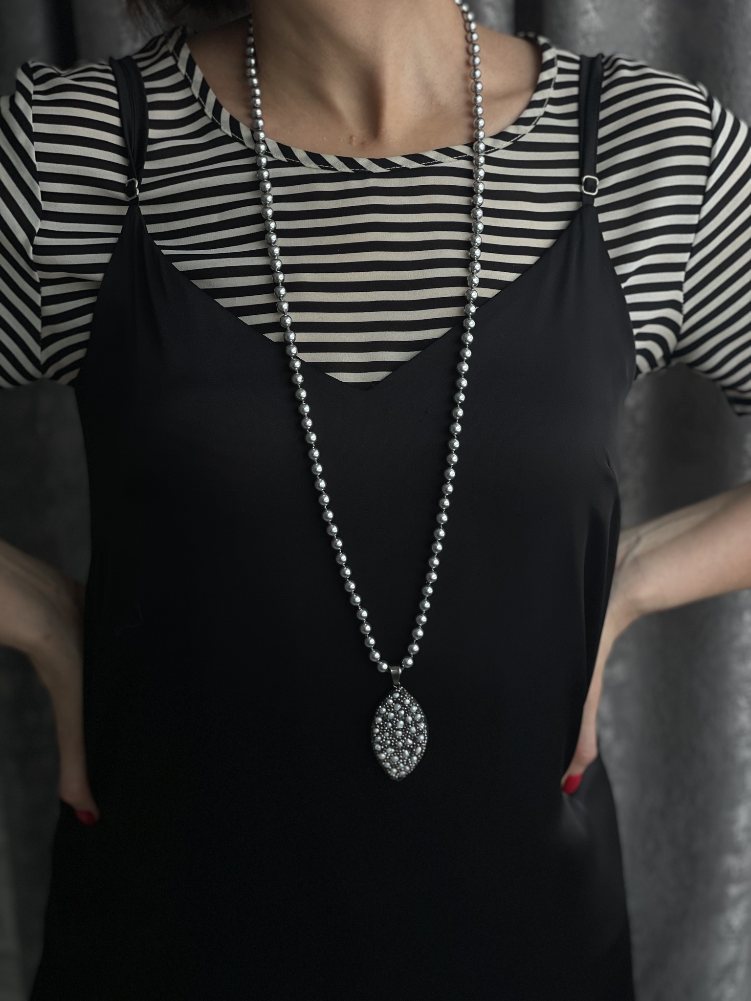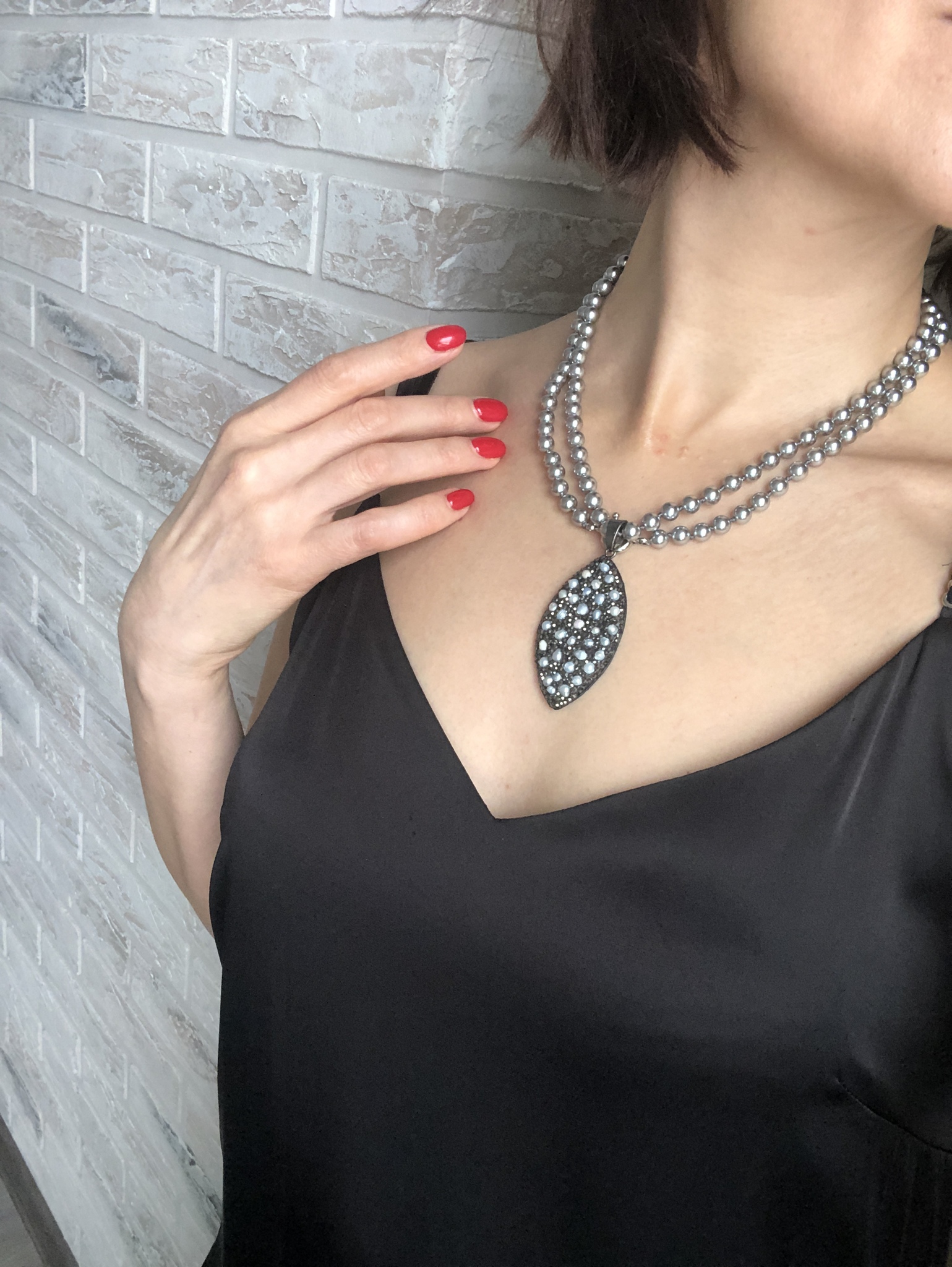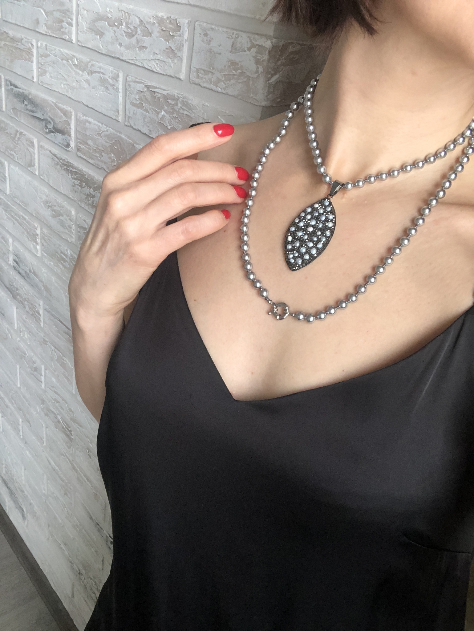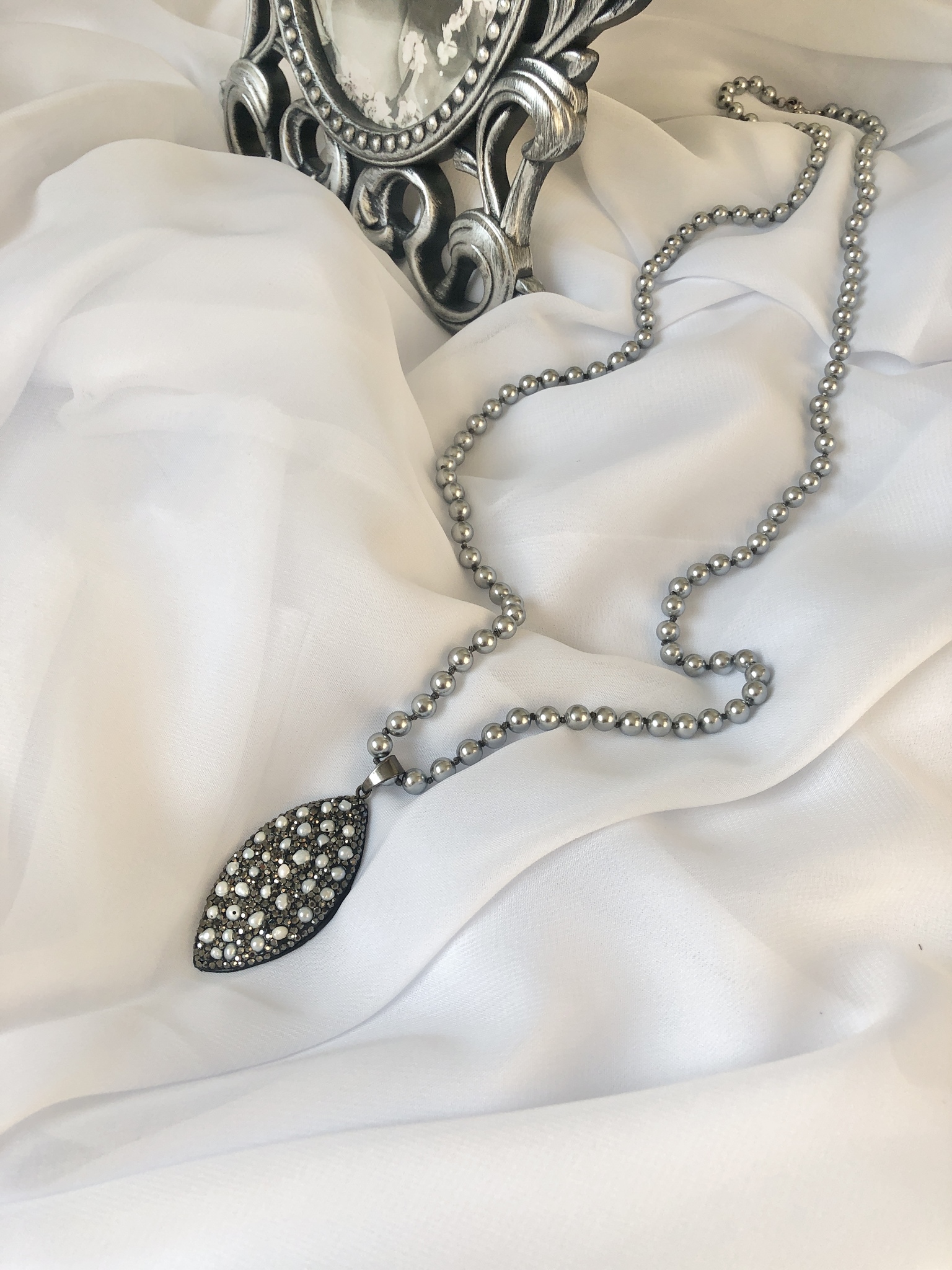 Кулон капля на коже с барочным жемчугом и кристаллами на бусах из серого жемчуга Майорка, Италия.