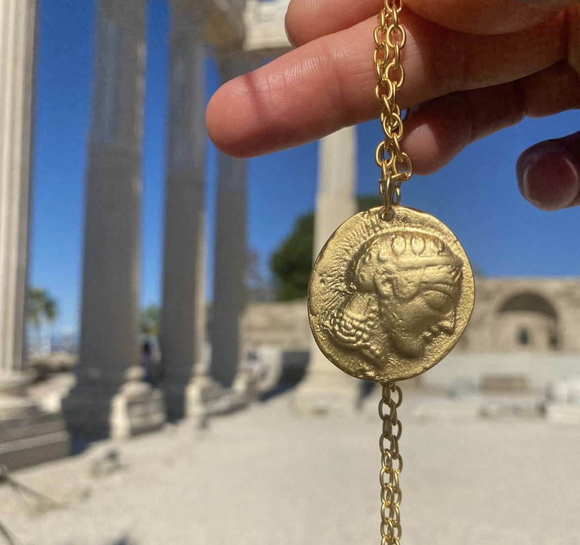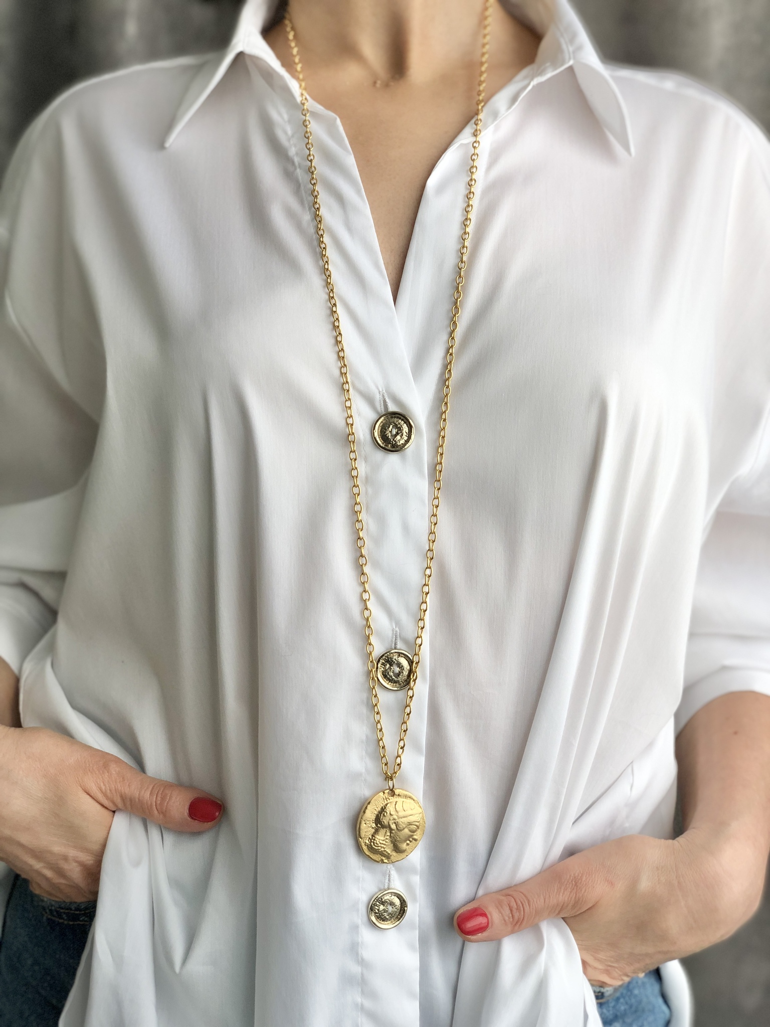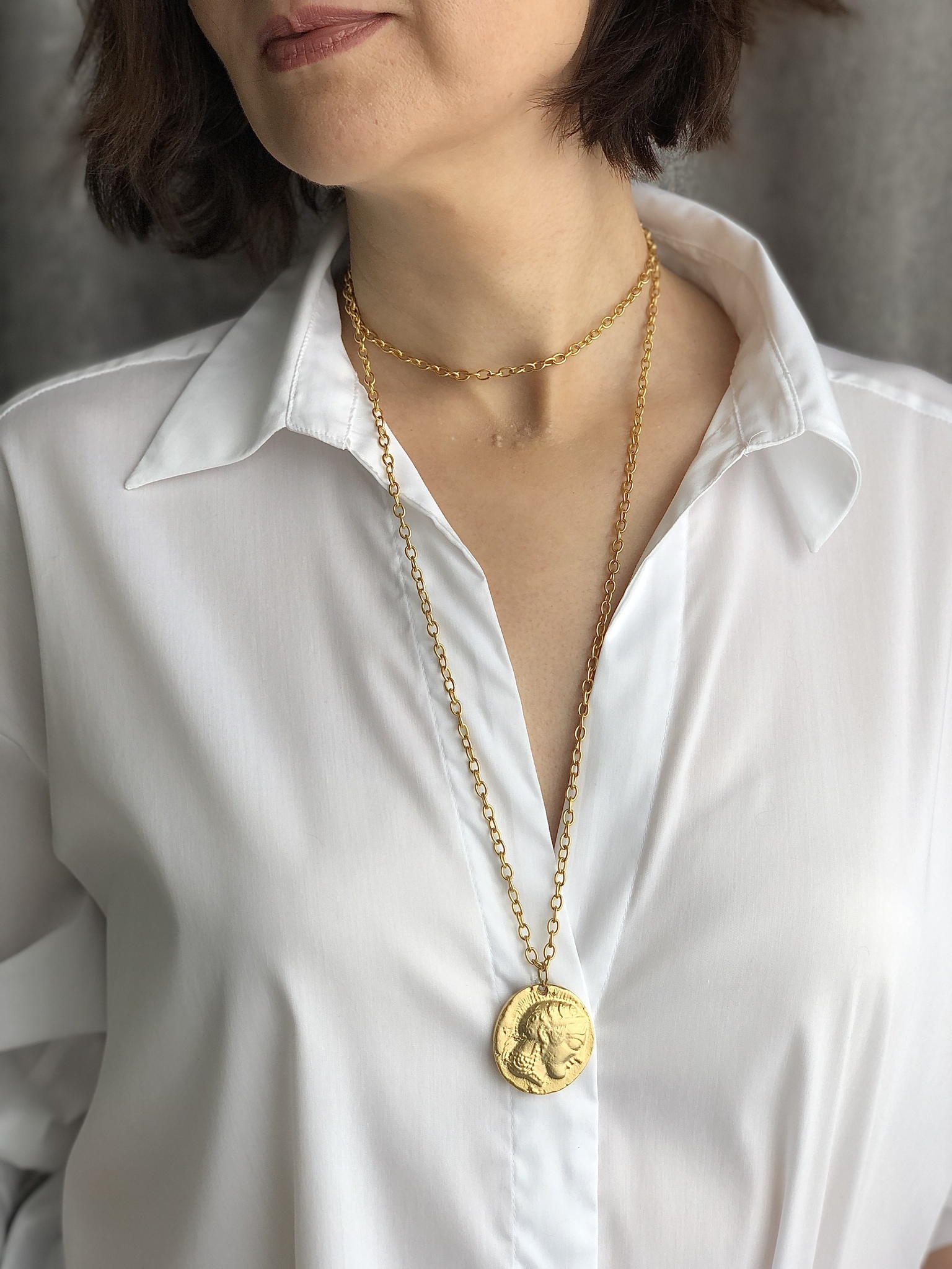 Кулон-монета винтаж матовое золото на тонкой золотой цепочке, Италия.