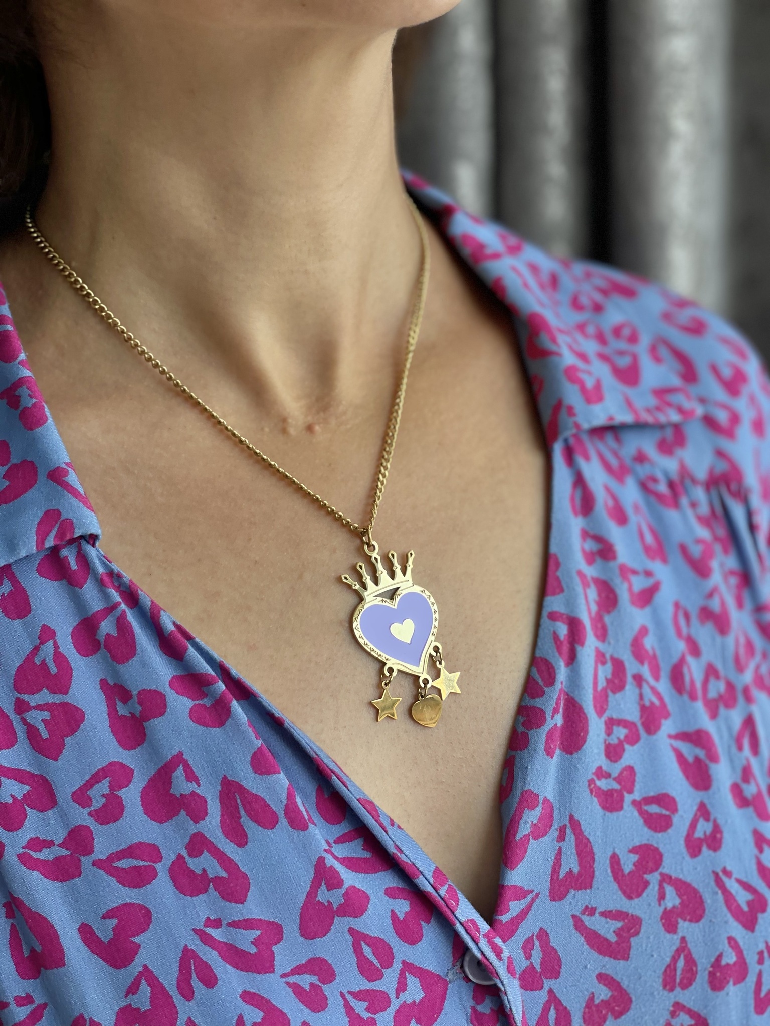 Кулон на цепочке сердце с короной и подвесами, сиреневая эмаль, Италия