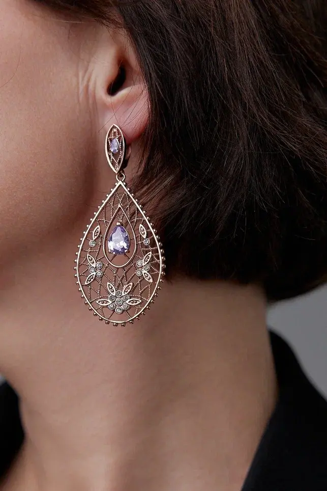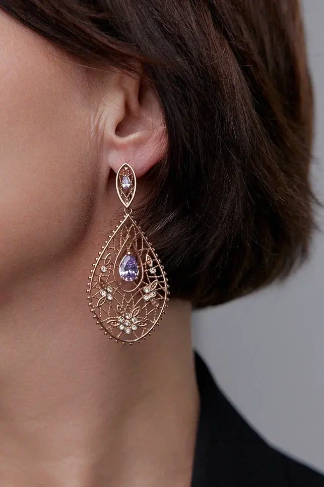 Серьги из латуни с фианитами и ювелирным стеклом. Золочение. Английский замок. Длина 6,5 см.