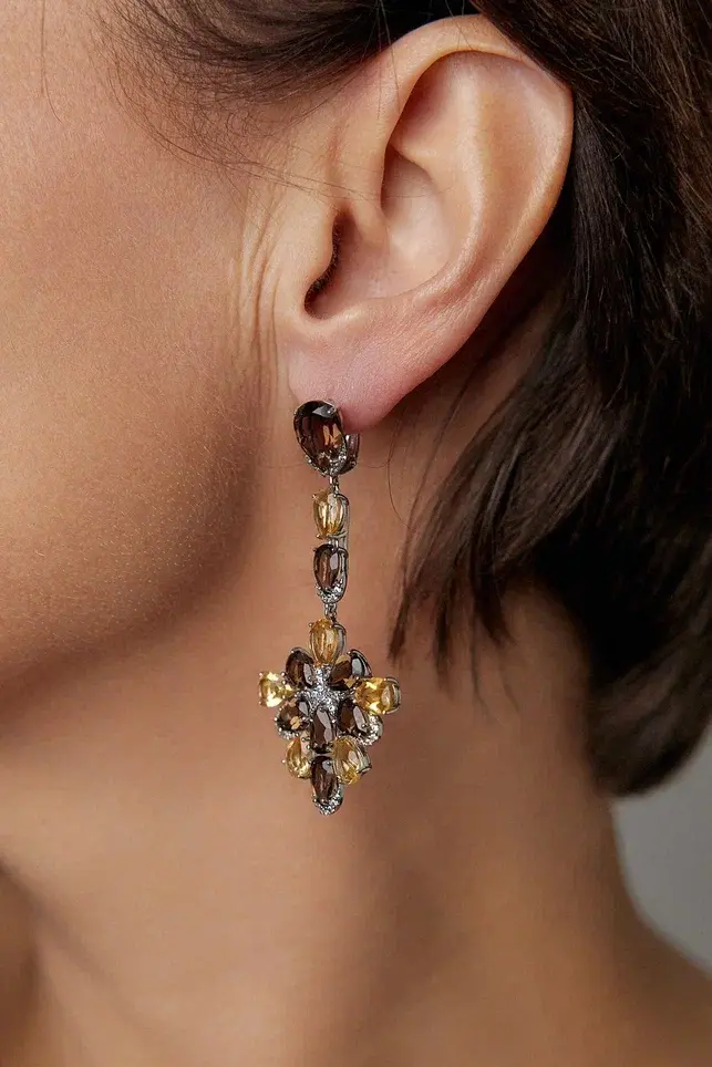 Серьги на английском замке с фианитами, цитринами и раухтопазами. Серебро 925.