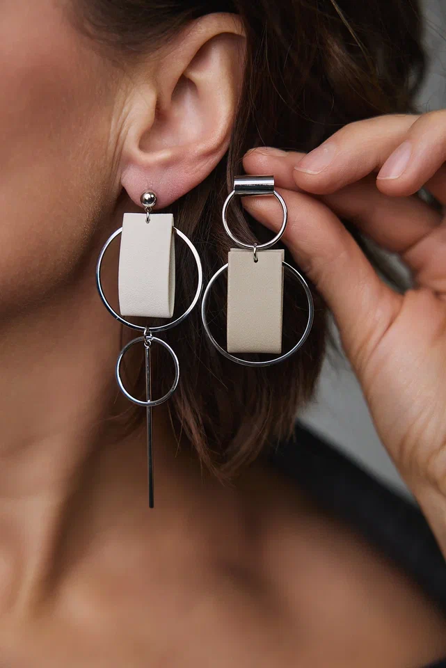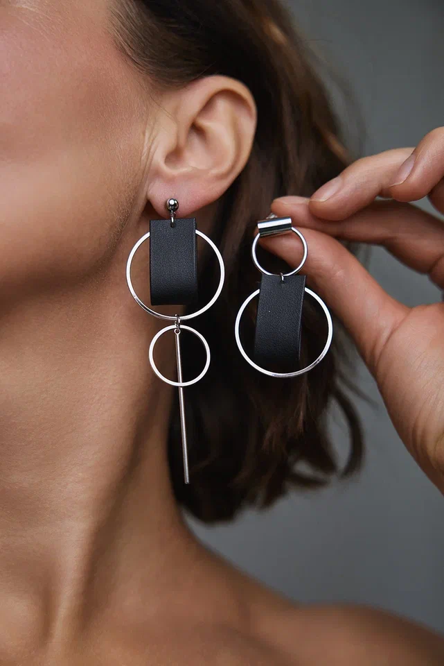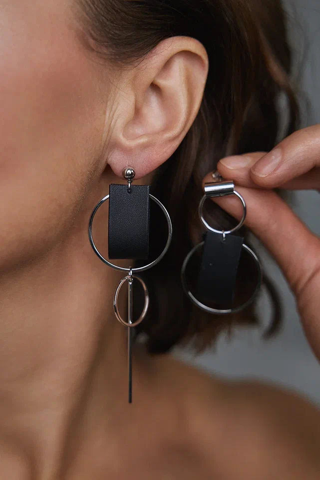 Серьги асимметричные пусеты круги с черной кожей, оттенок серебро