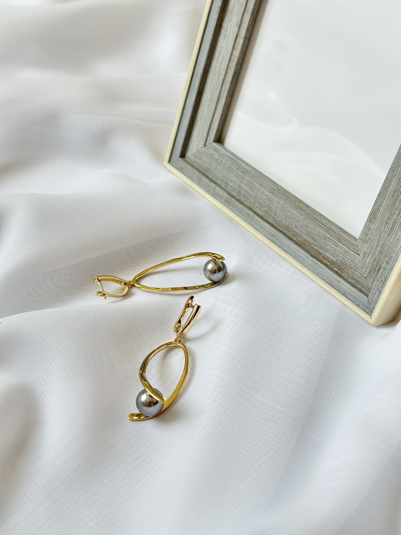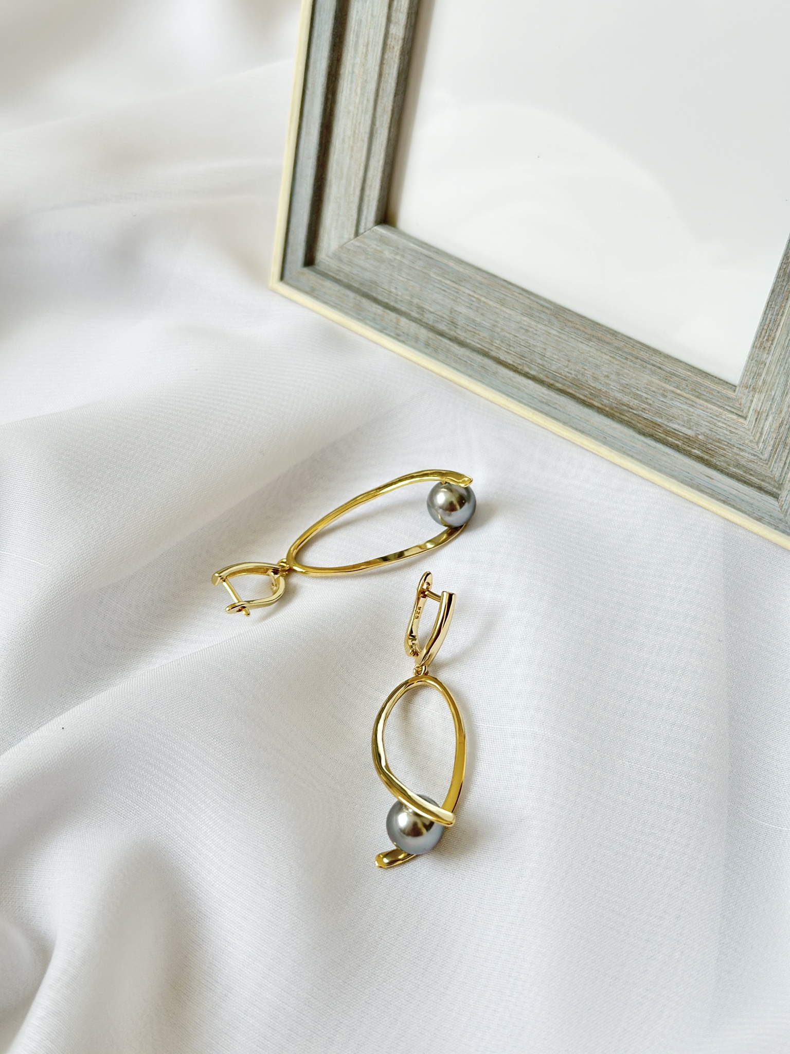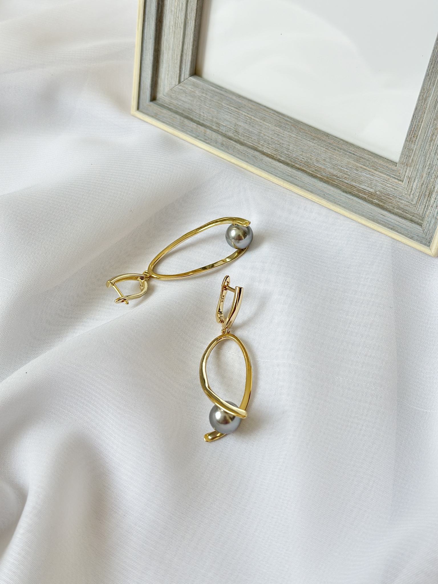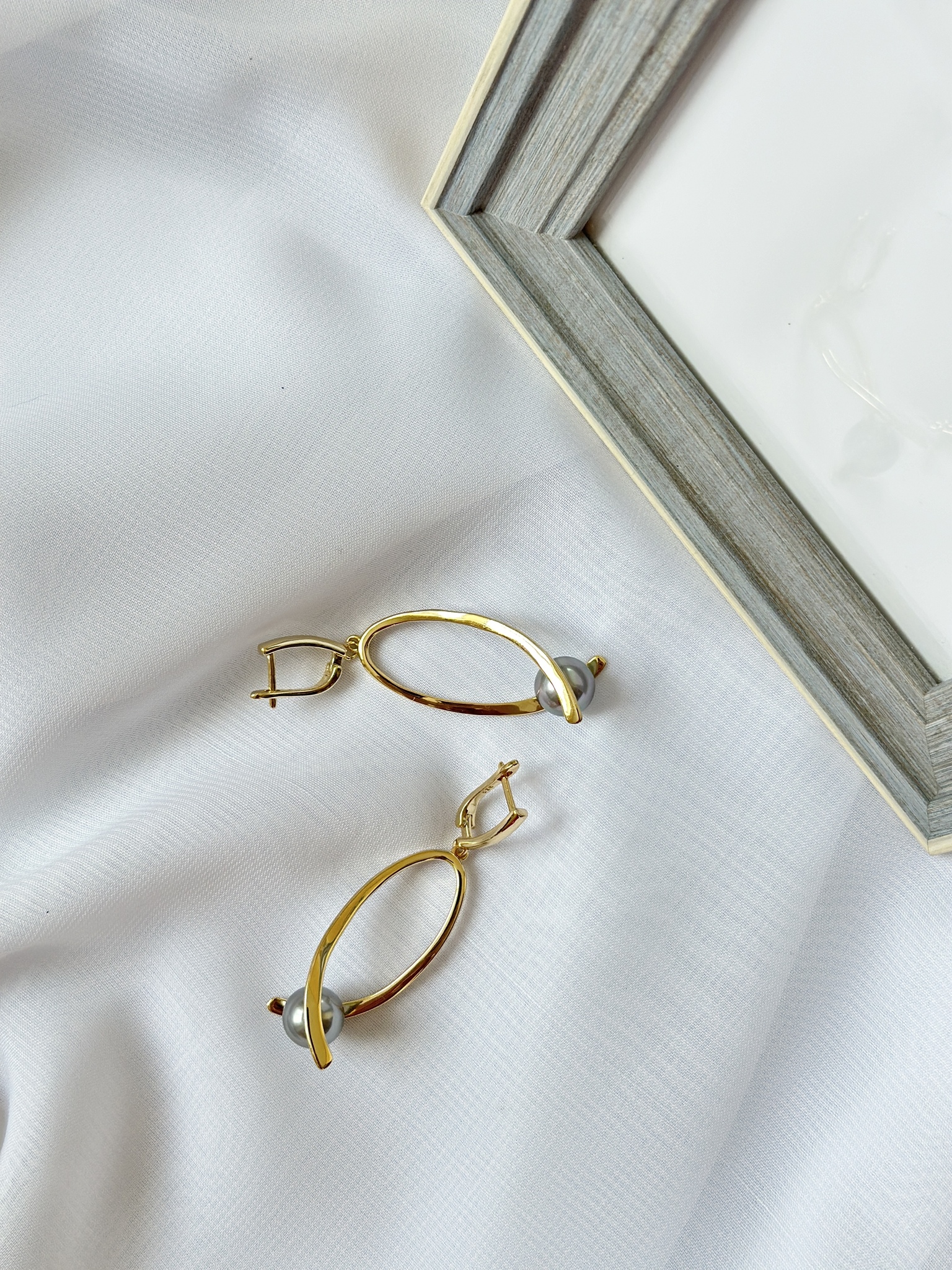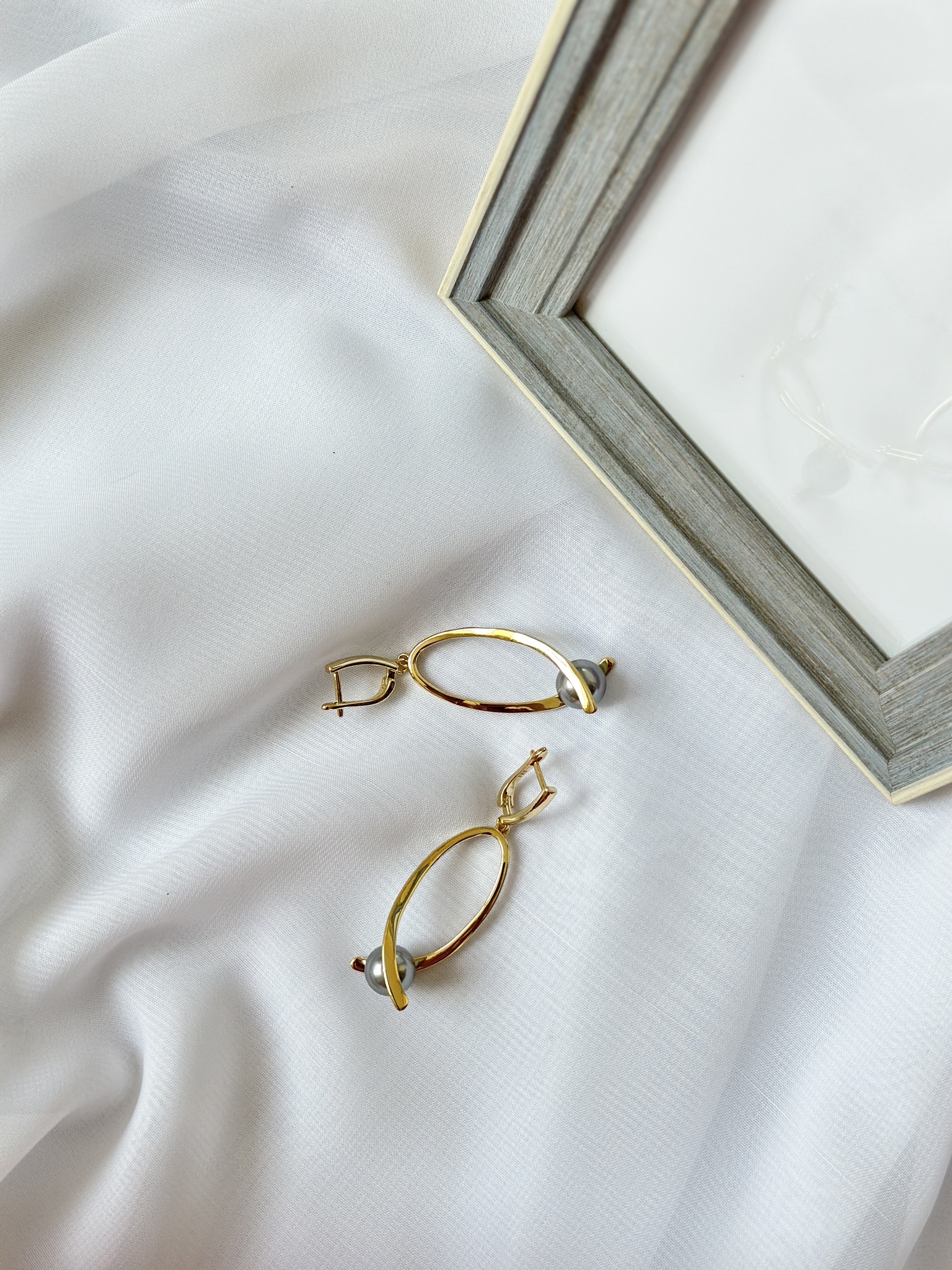 Серьги большие треугольники с серой жемчужиной Майорка, оттенок золото. Английский замок. Длина 6 см. Диаметр жемчужины 1 см.