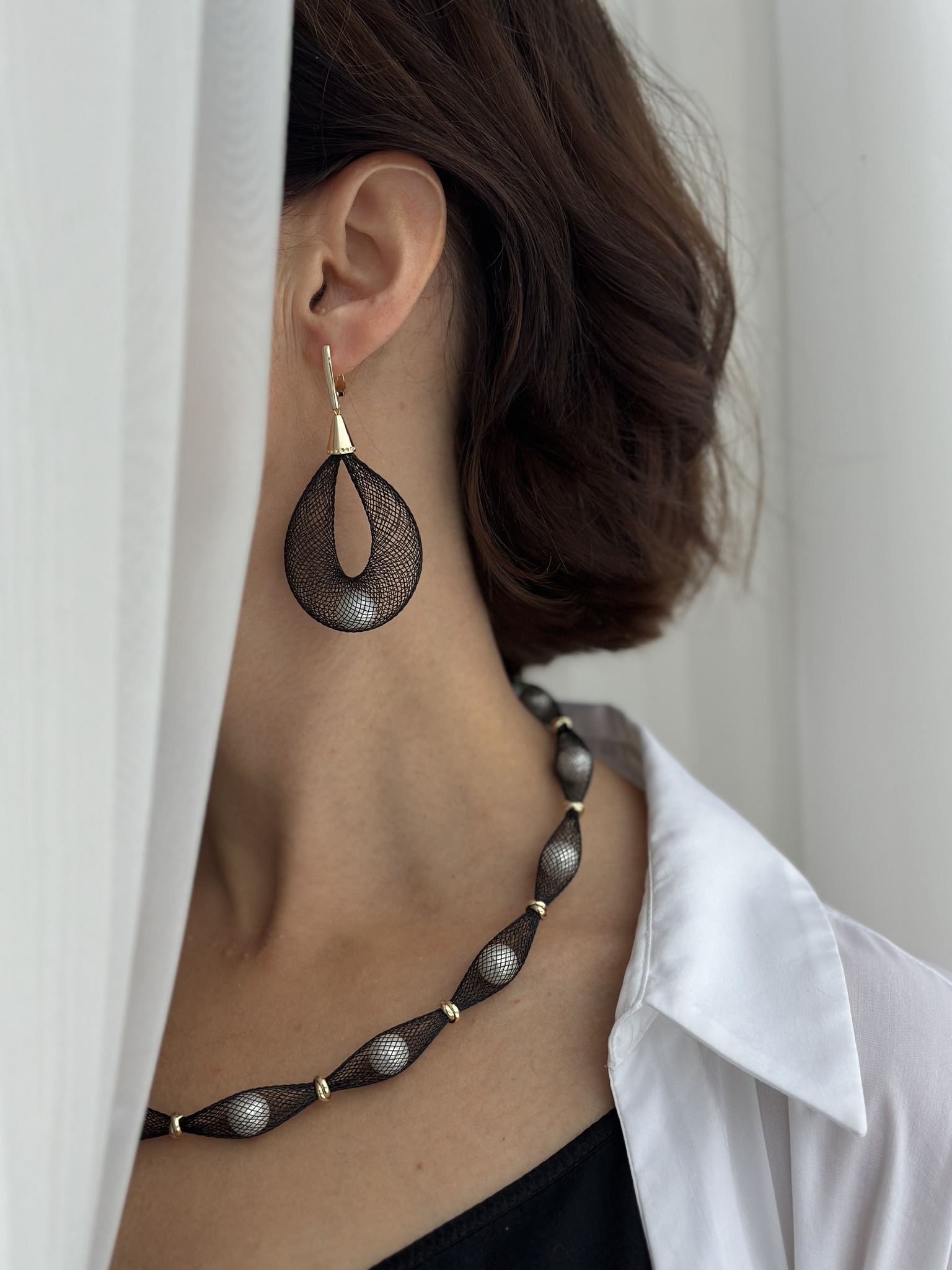 Серьги черная сетка с белым жемчугом Майорка, оттенок золото. Английский замок. Родированный сплав.