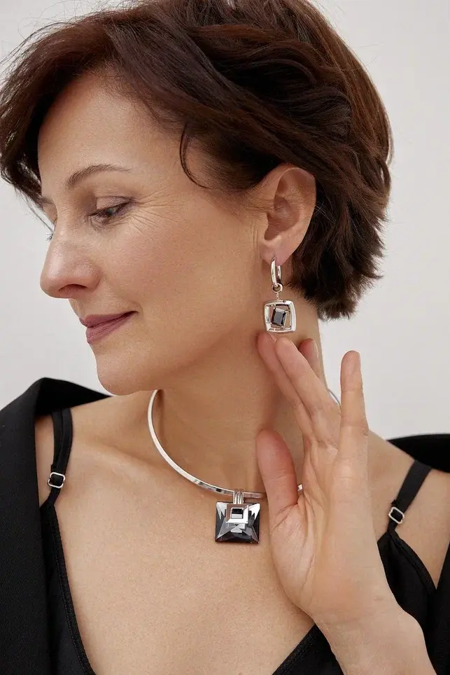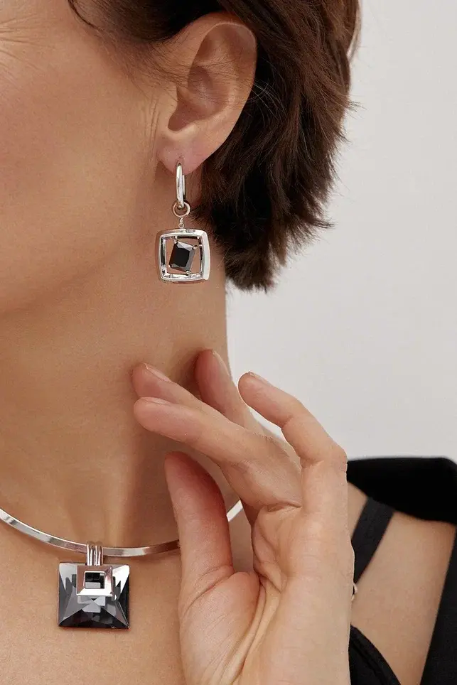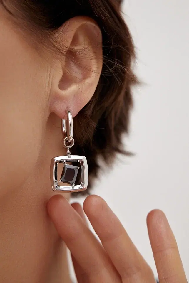 Серьги черный прямоугольный кристалл в серебряном квадрате, замок скоба. Кристалл съемный, поэтому серьги можно носить и как лаконичный вариант конго. Длина 4 см. Подвес-кристалл 2 х 2 см. Кольцо 2 см в диаметре.