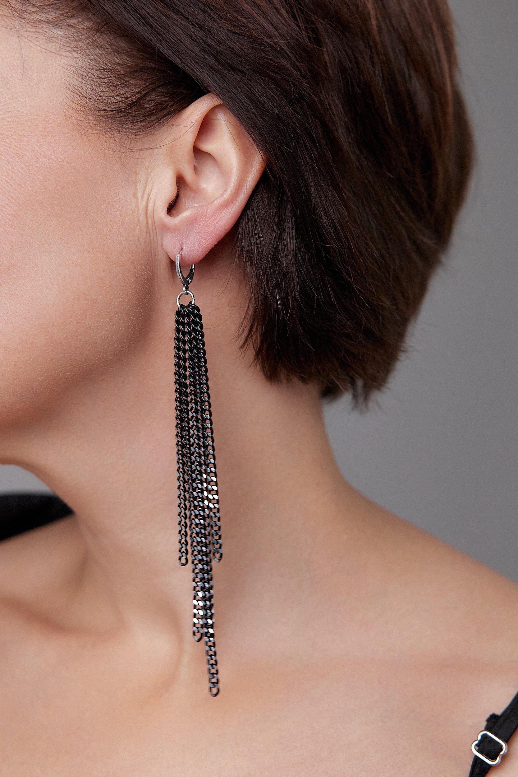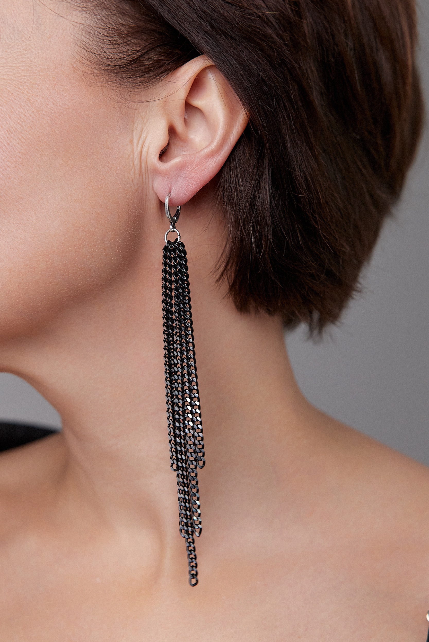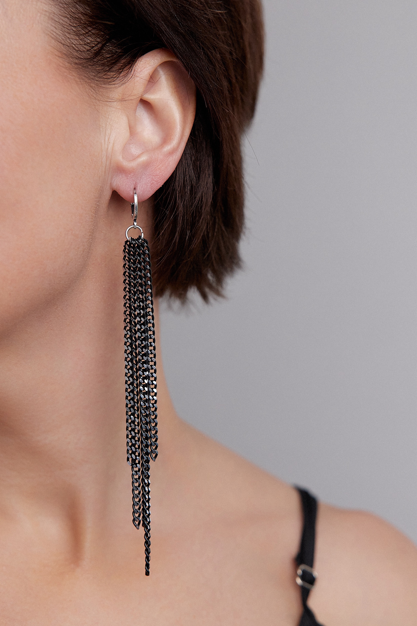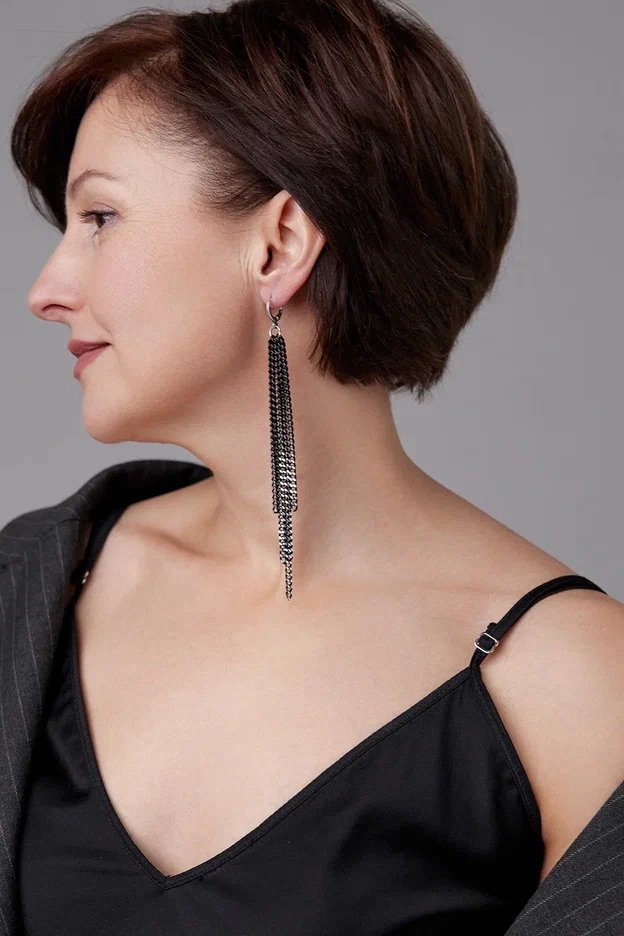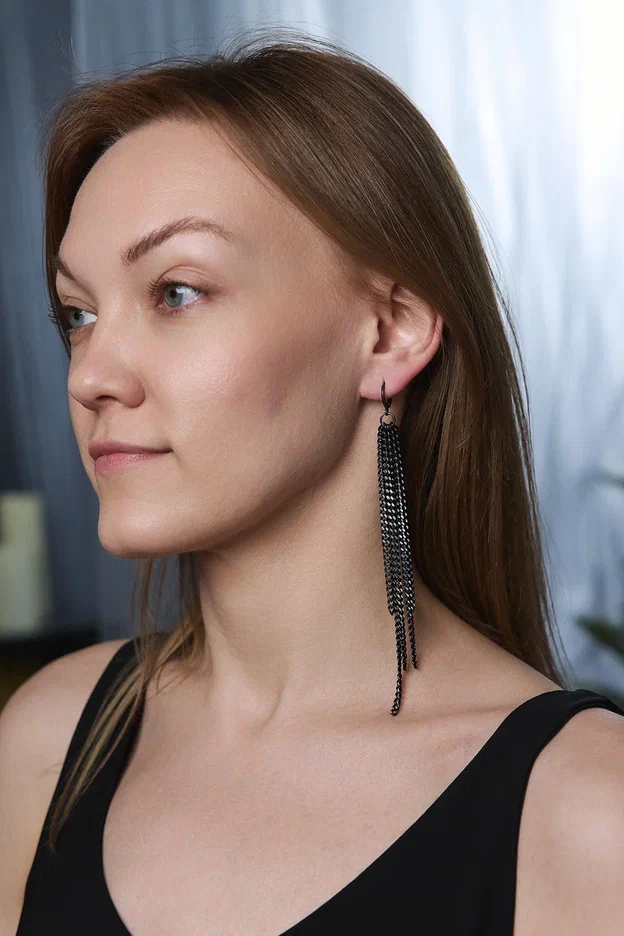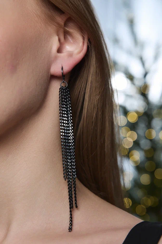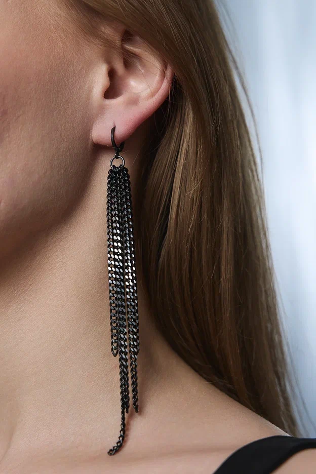Серьги длинные цепочки на замке левербек, черные с серебряными гранями