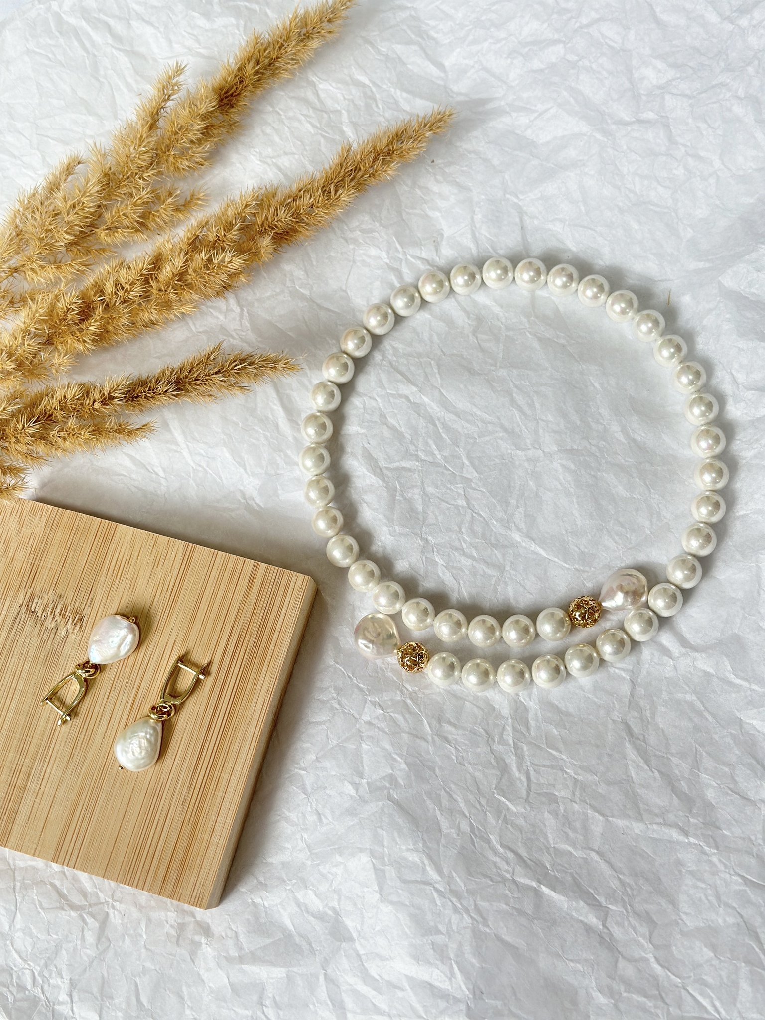 Серьги из белых барочных жемчужин каплевидной формы на английском замке, оттенок золото