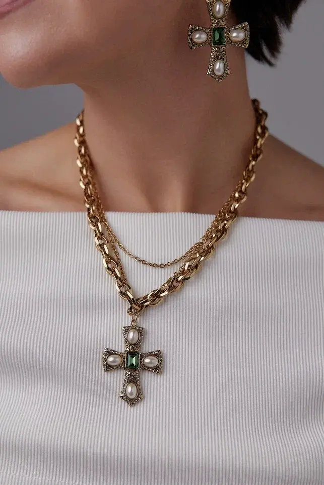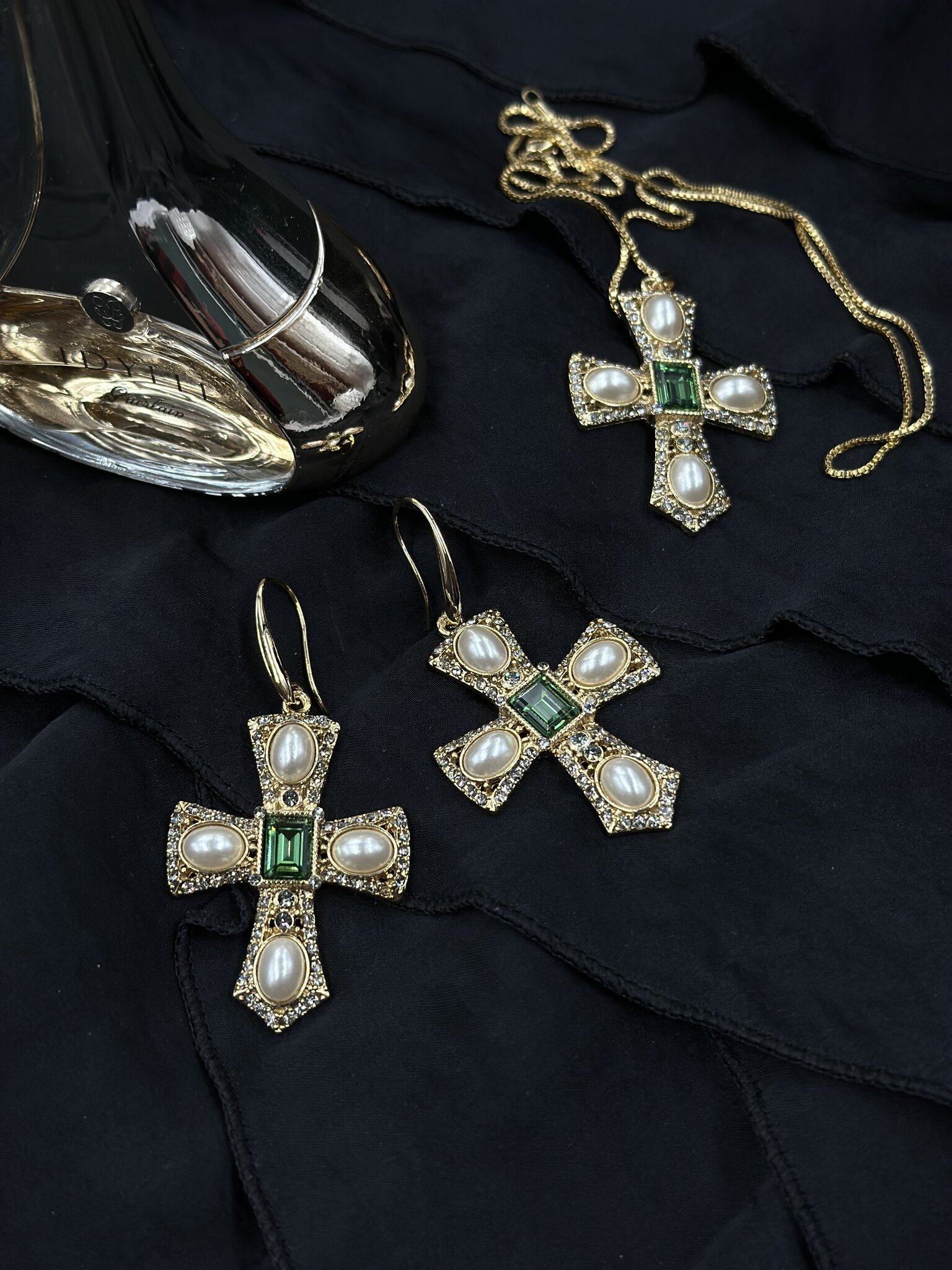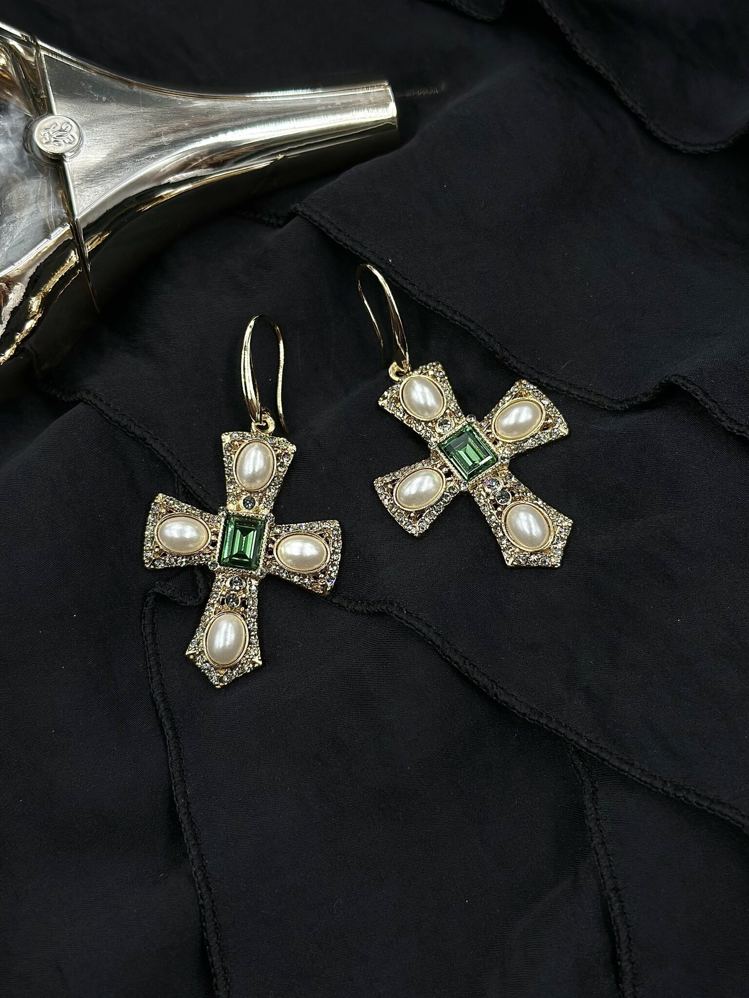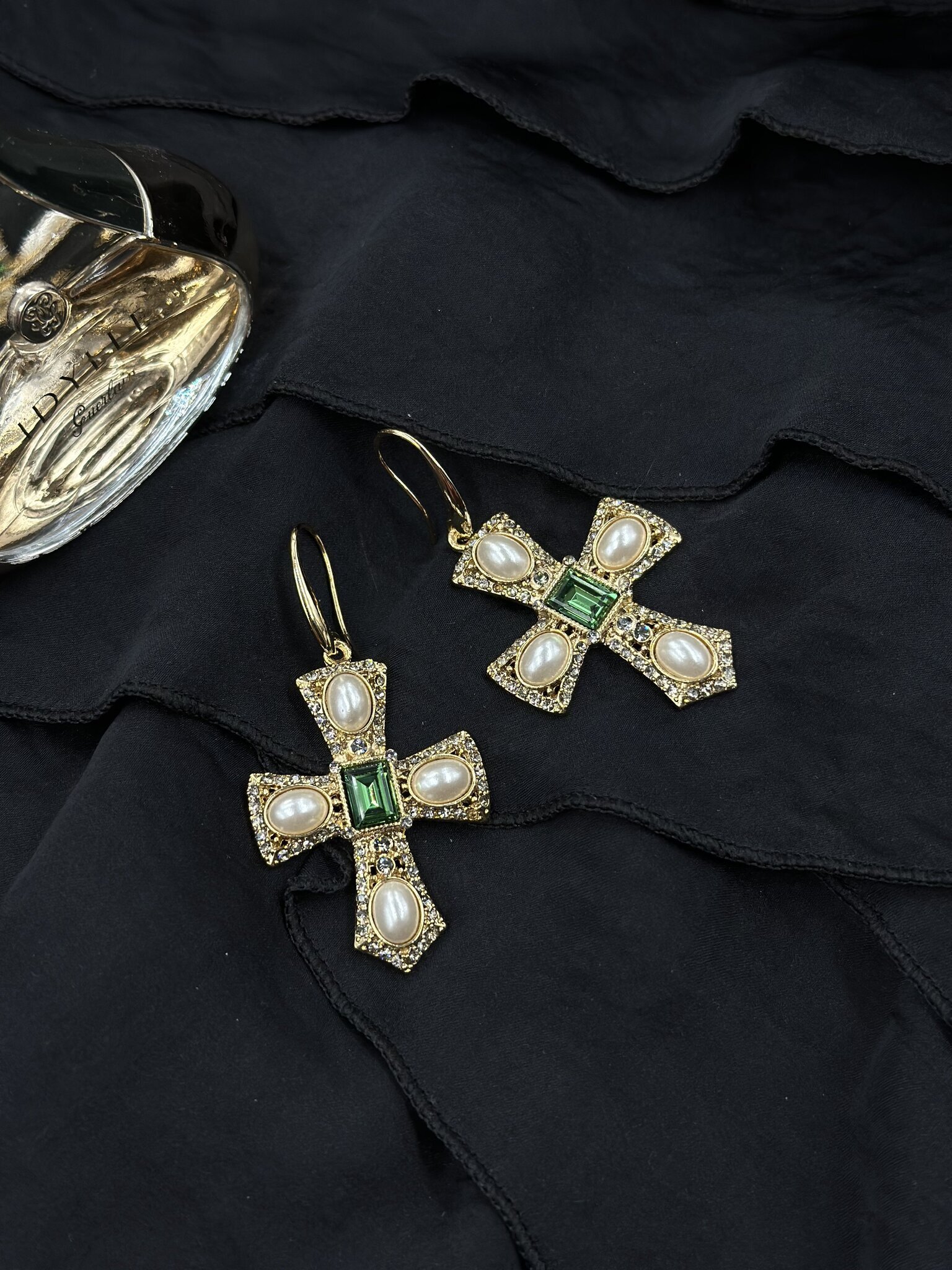 Серьги кресты с зеленым кристаллом, цирконами и жемчугом (имитация), оттенок золото. Замок петля. Длина сережек 6 см, ширина 3,5 см.
