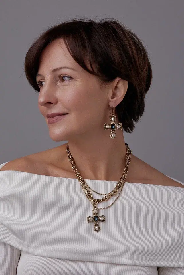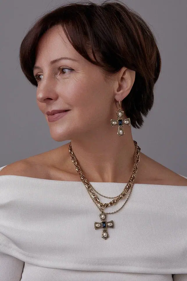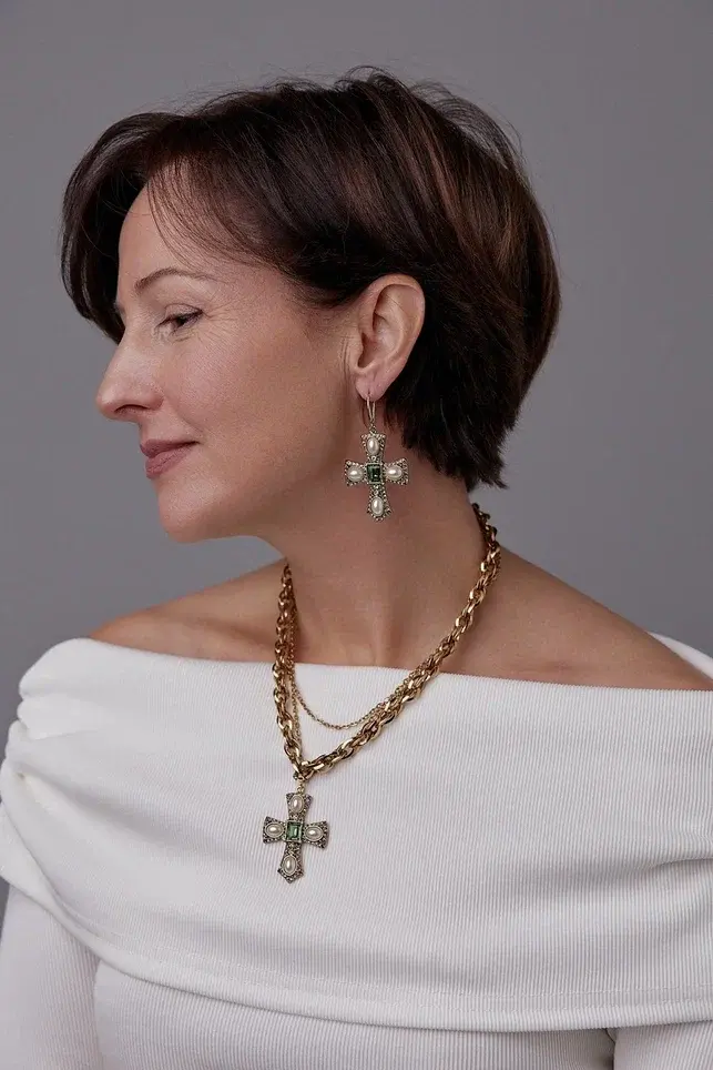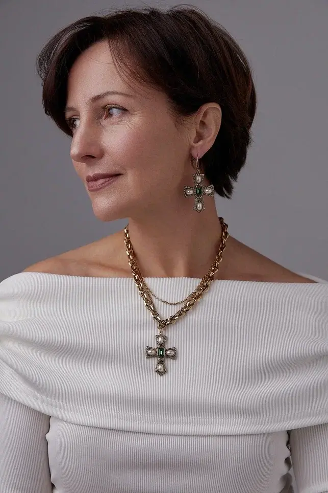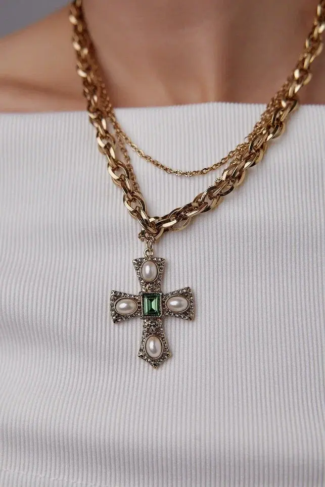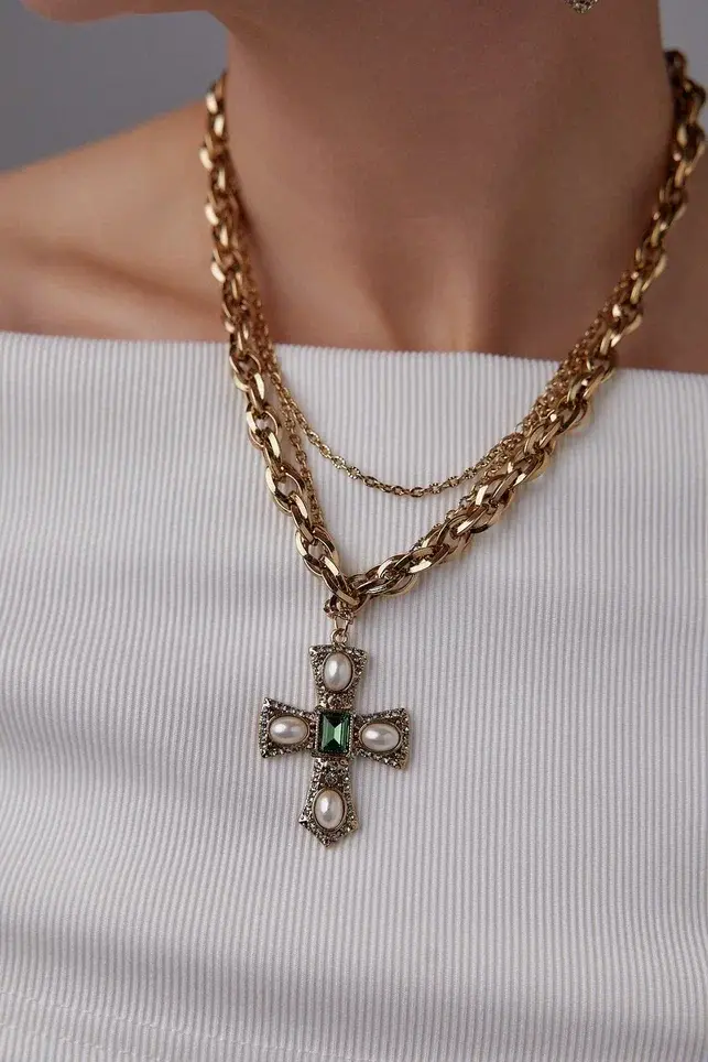 Серьги кресты с зеленым кристаллом, цирконами и жемчугом (имитация), оттенок золото. Замок петля. Длина сережек 6 см, ширина 3,5 см.