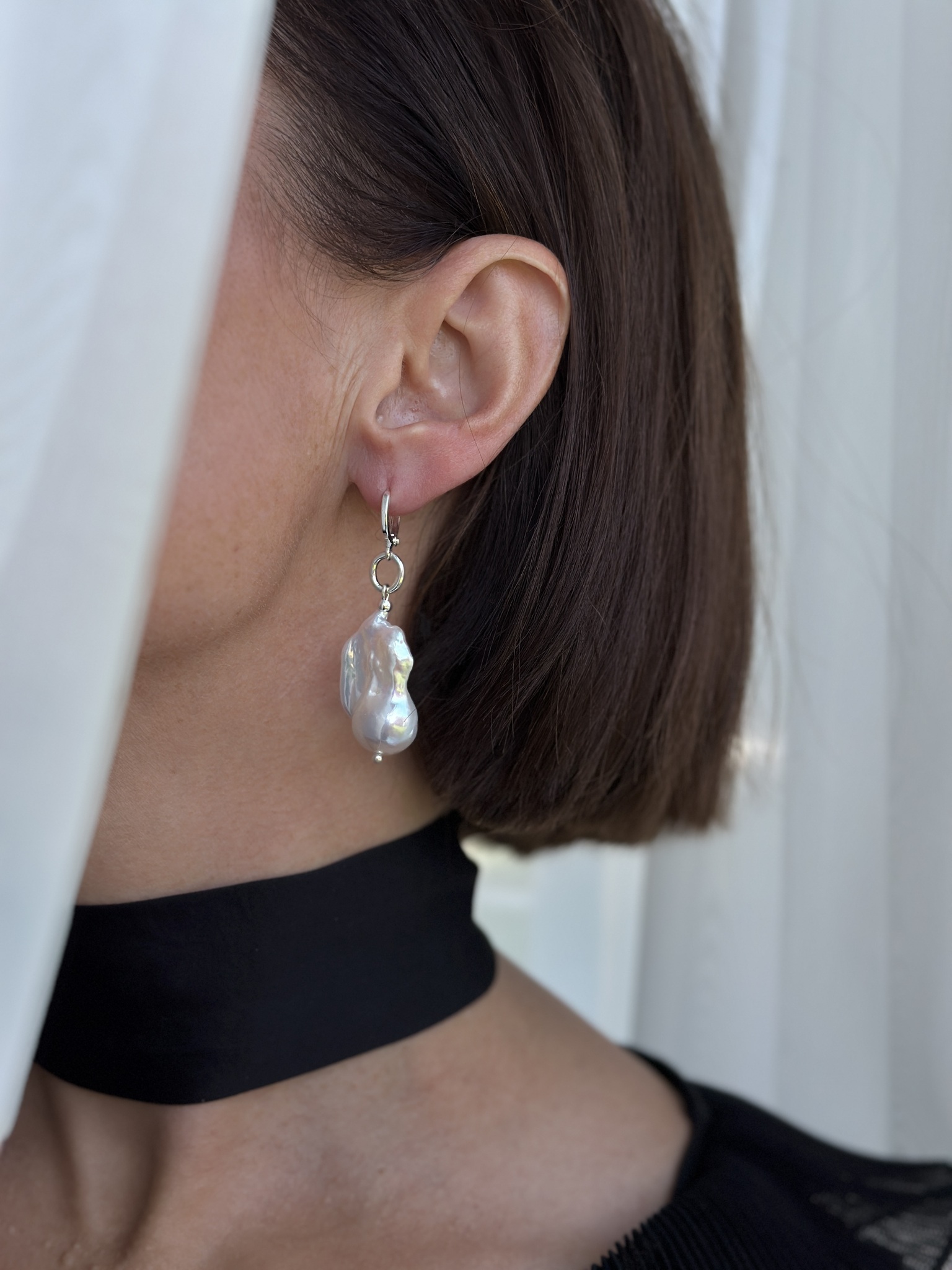 Серьги с крупной барочной жемчужины. Замок левербек. Оттенок светлое серебро.