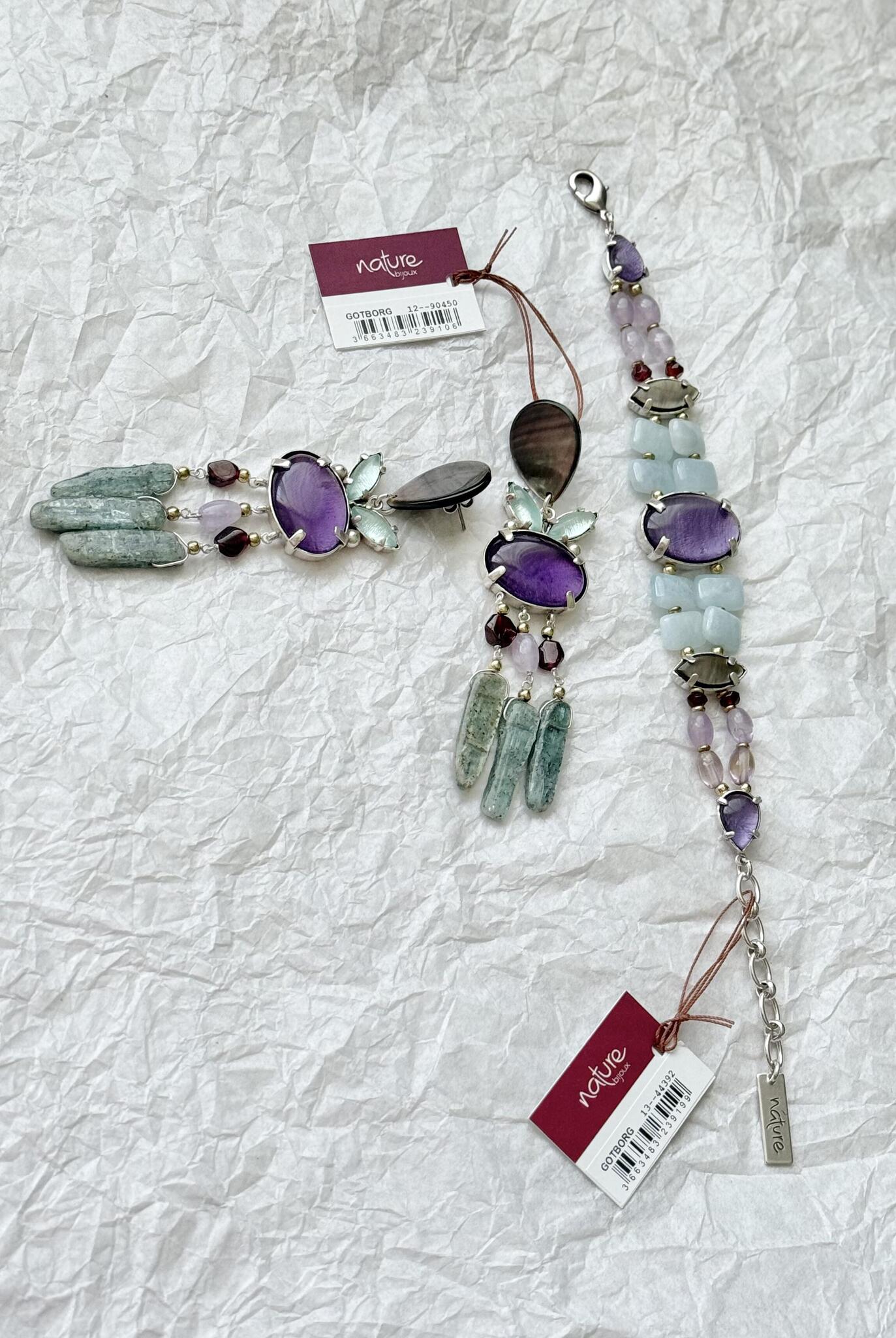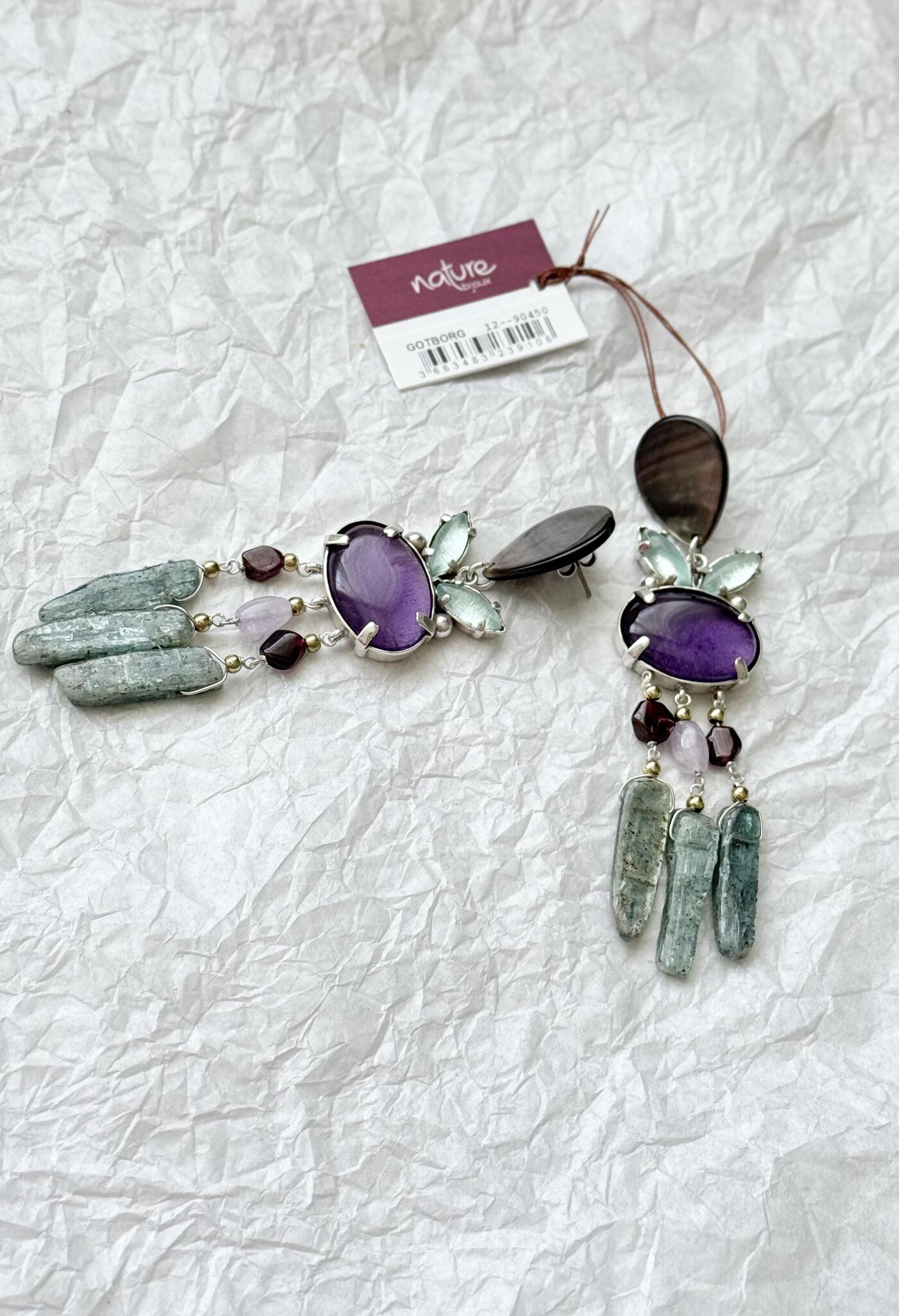 Серьги-пусеты с ракушкой Capiz в смоле, перламутром, гранатом, кианитом и аметистом.