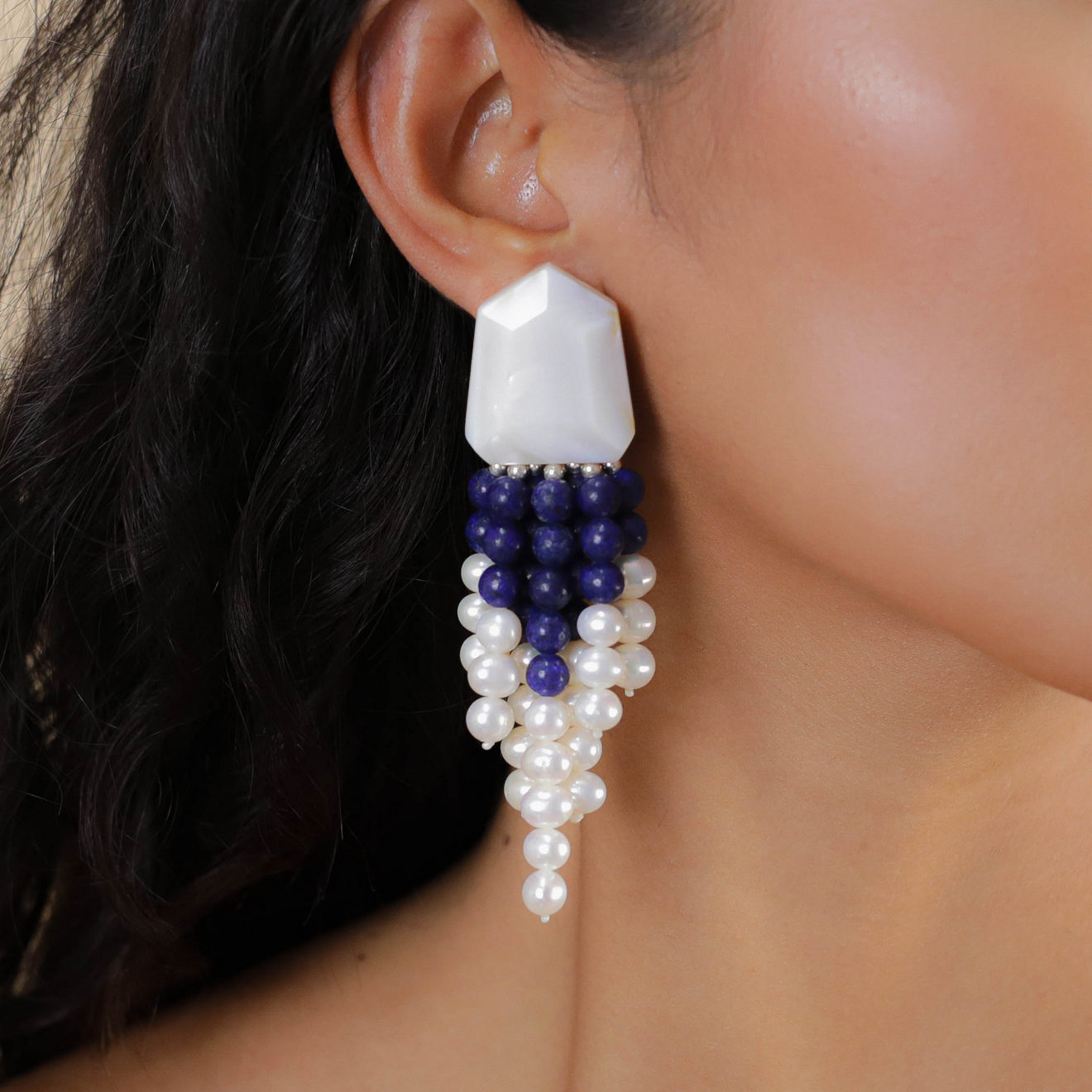 В основе серёг — прочный бижутерный сплав с благородным серебристым покрытием, который надежно защищает изделие от потускнения и сохраняет его внешний вид на протяжении долгого времени. Особое внимание привлекает натуральная вставка из перламутра: ее нежное сияние играет на свету переливами, придавая серьгам элегантность и шарм. Длина изделия составляет 3 см — оптимальный размер для повседневного ношения и вечерних выходов. Удобный замок типа левербек обеспечивает надежную фиксацию серег и комфорт в течение всего дня.
