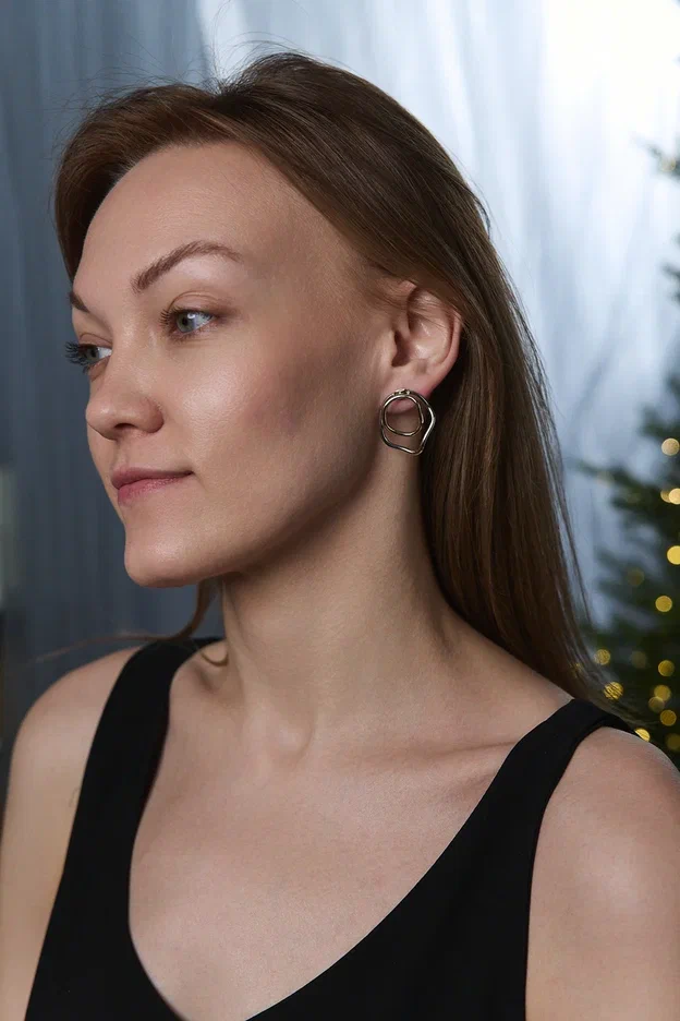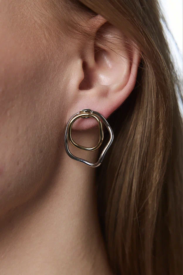 Серьги пусеты двойные неровные круги,оттенки золото и серебро