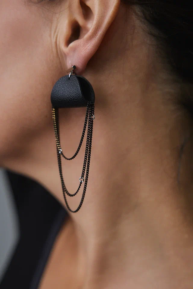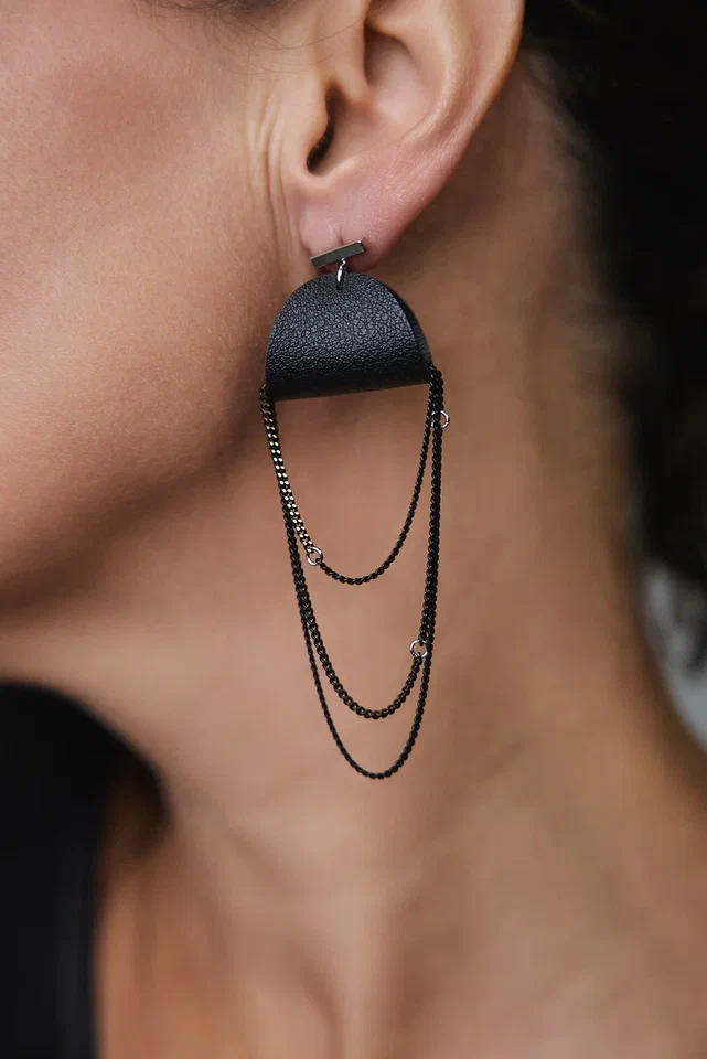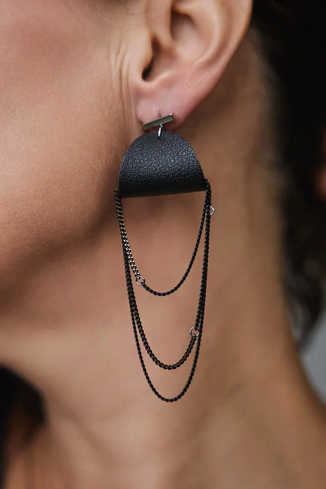 Серьги пусеты из черной кожи с черно-золотыми цепочками