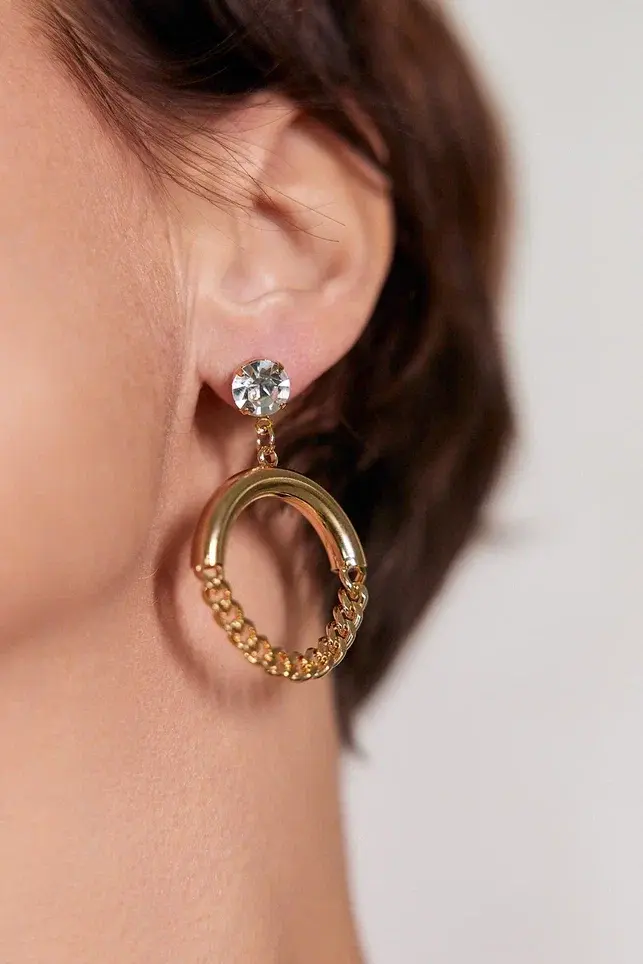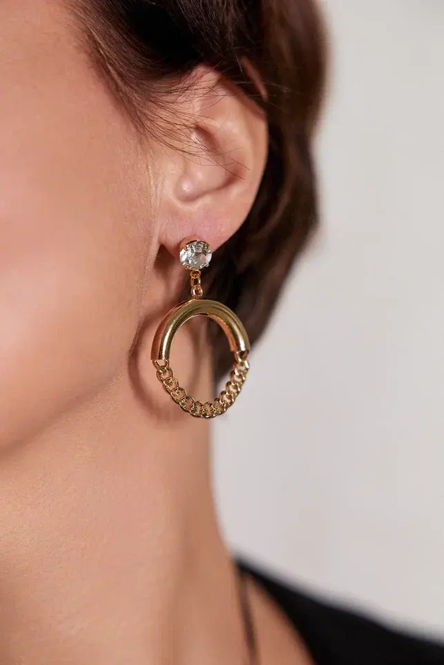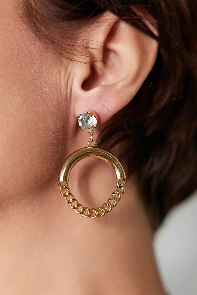 Серьги пусеты прозрачный кристалл, полукруг и цепь, оттенок золото. Размер 4,5 х 3 см.