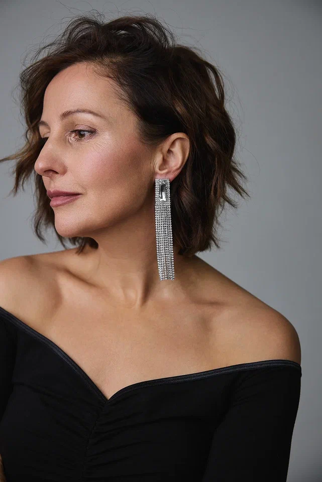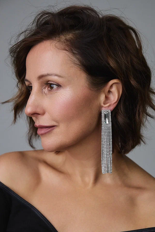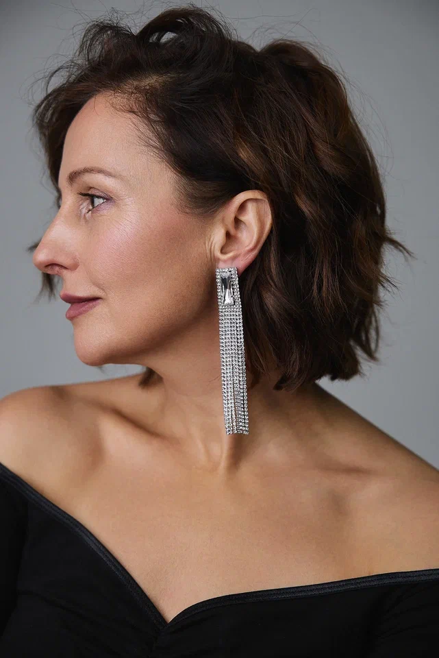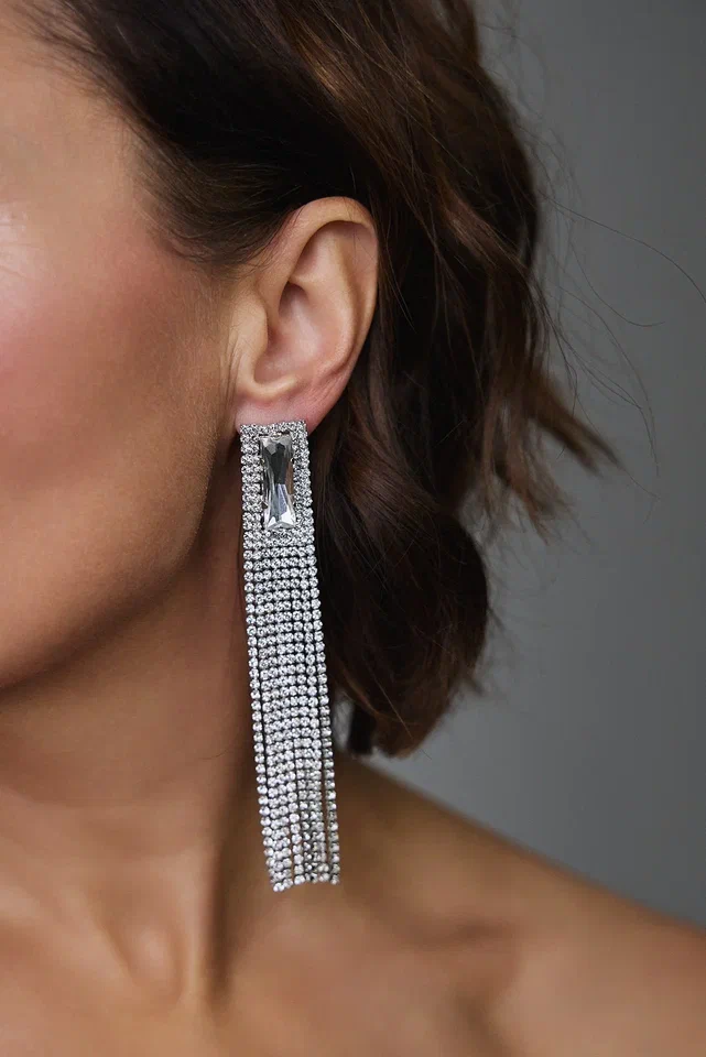 Серьги пусеты с прямоуг. кристал. и длин.нитями из мелких прозр.крист, оттенок серебро