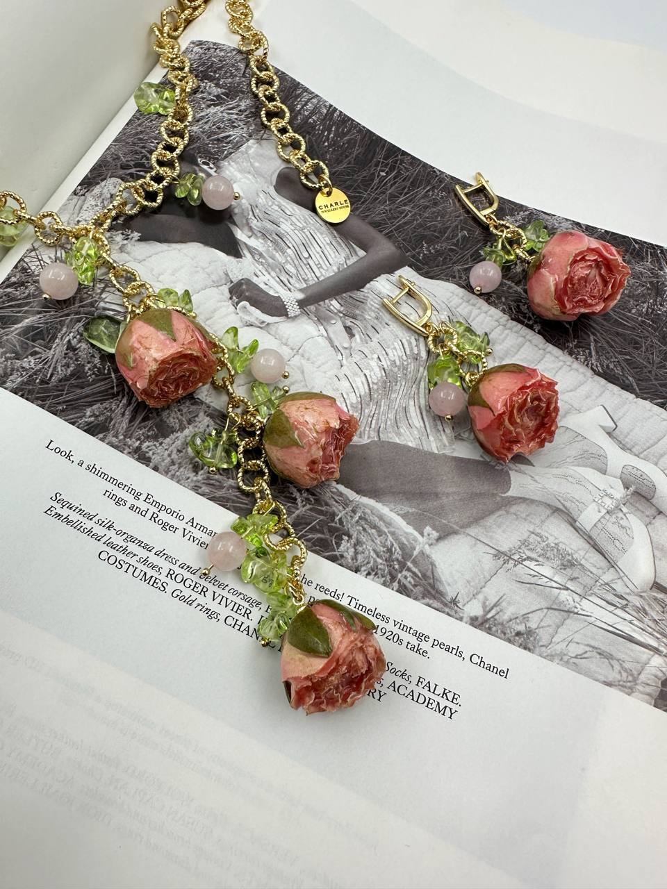 Серьги "Розы" бутоны натуральных роз в персиковом оттенке и кварцы, оттенок золото