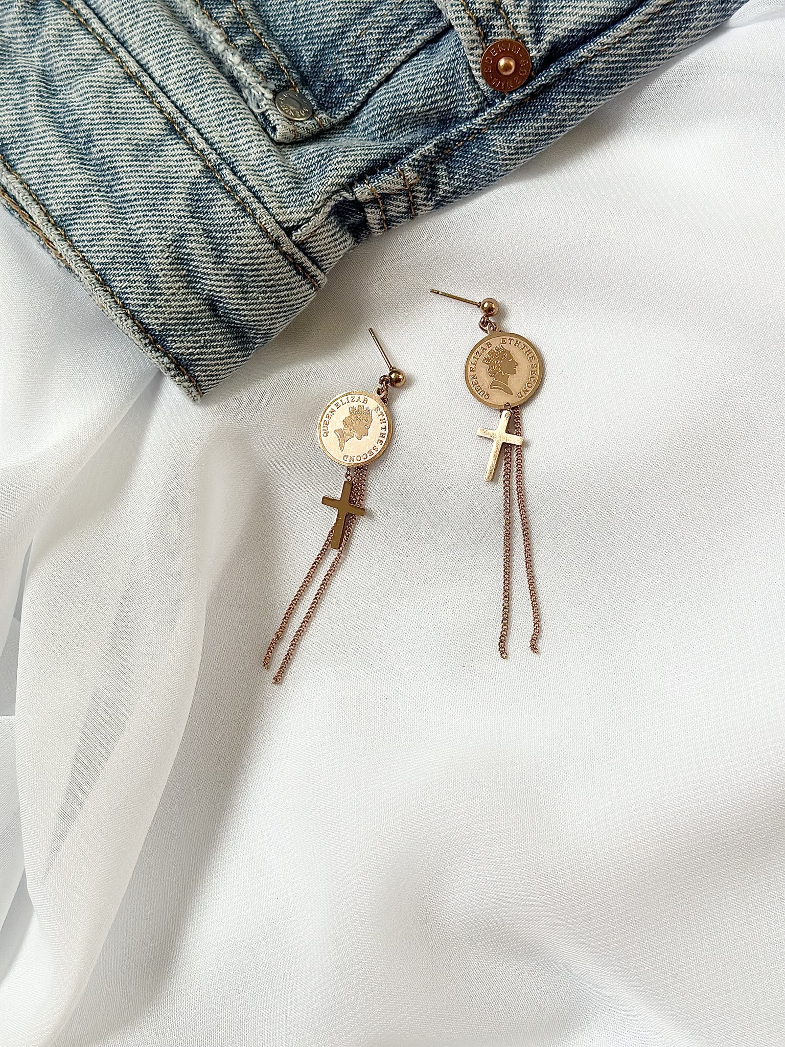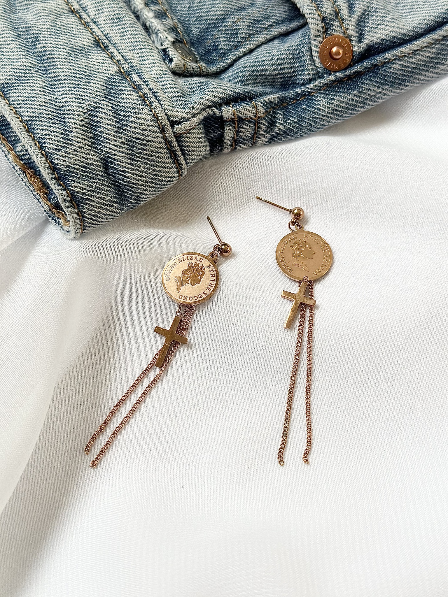 Серьги пусеты с монетой, двумя цепочками и крестом, оттенок золото. Сталь.