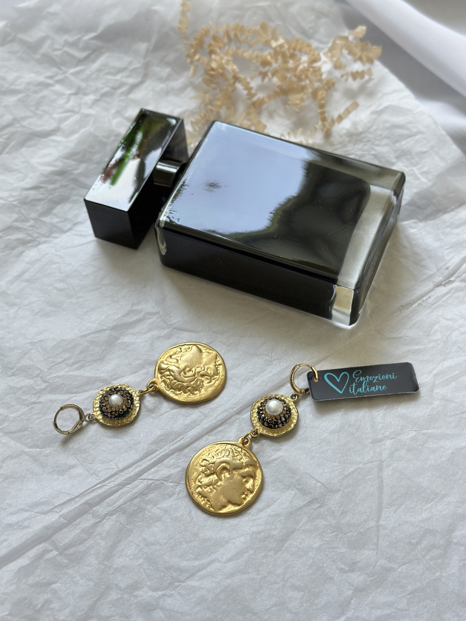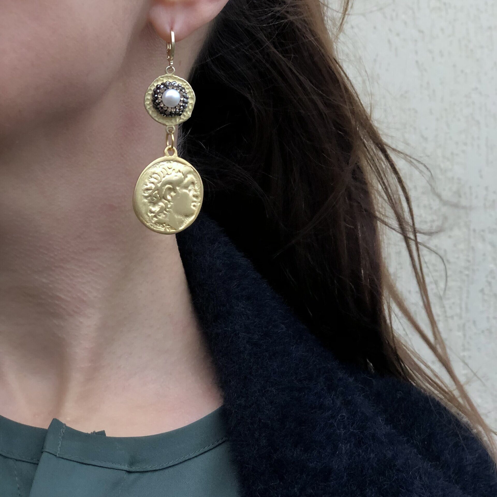 Серьги с монетой, фактура матовое золото, с кристаллами и жемчугом, Италия. Замок левербек.