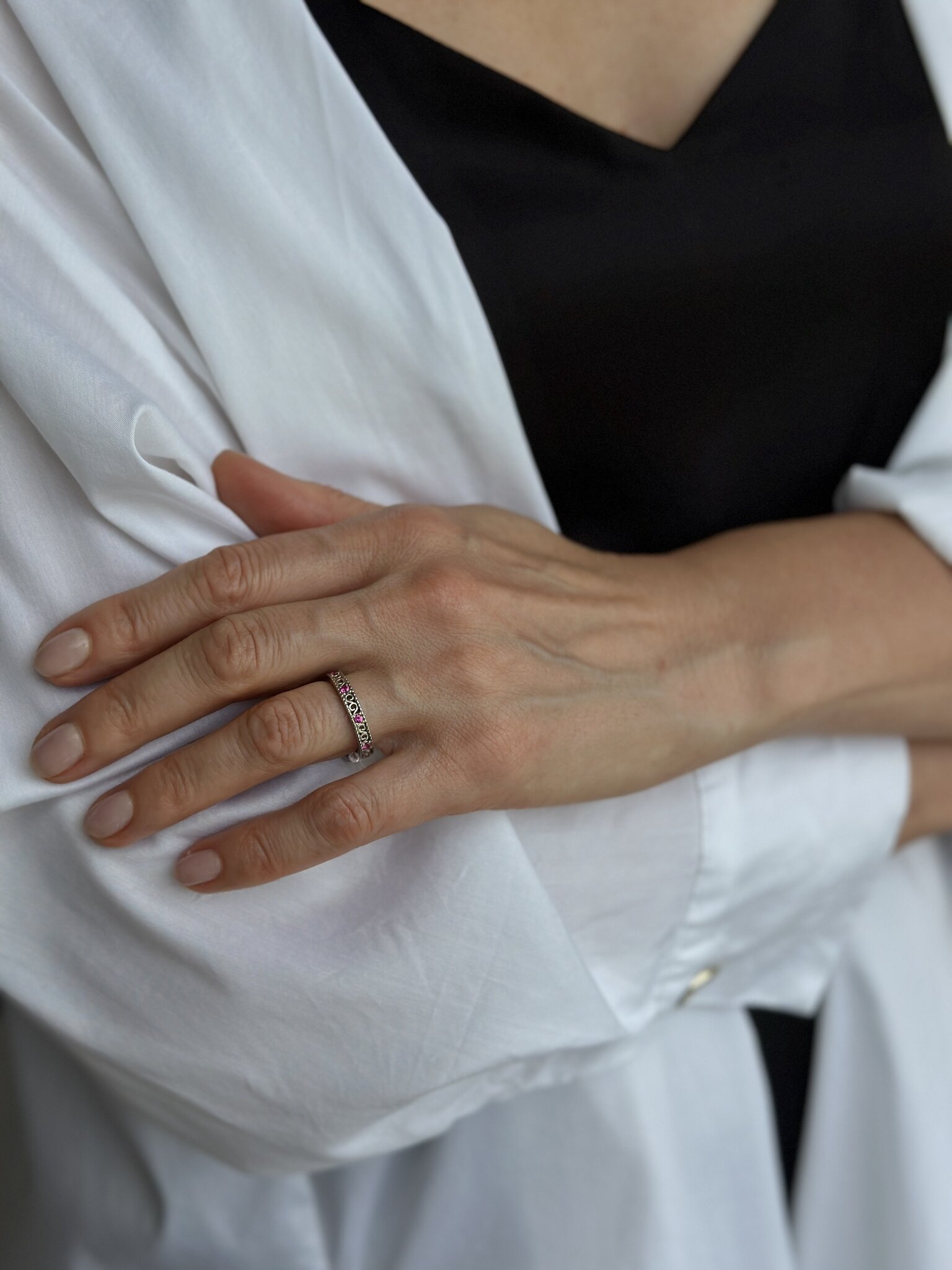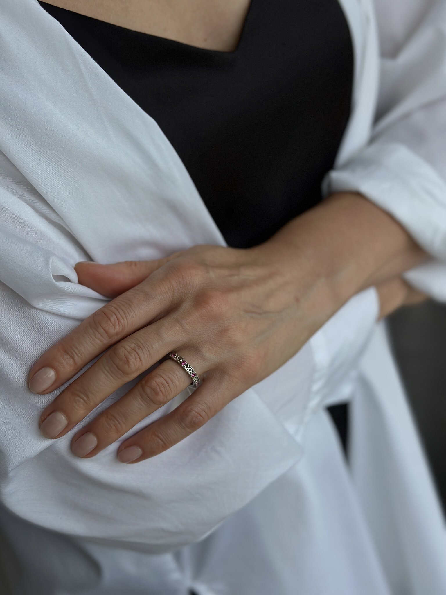 Cеребряное кольцо с фианитами в оттенке фуксия. Размер 16.